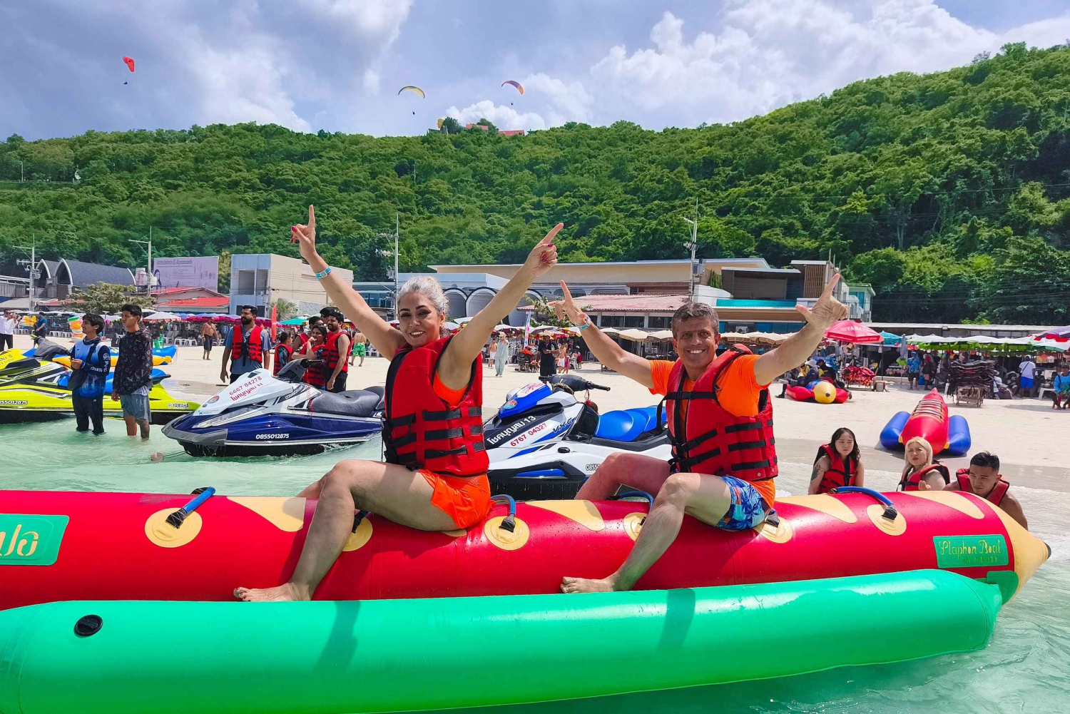 Start din dagstur fra Bangkok i en komfortabel VIP-minibus, der kører cirka 2 timer til Pattaya, og fra Pattaya bliver du hentet til molen på 15 minutter. Derefter går du ombord på en speedbåd for at krydse havet til Koh Larn. Oplev spændende parasailing over det glitrende blå hav, og nyd panoramaudsigten fra luften. Bagefter kan du prøve havvandring med en speciel undervandshjelm for at se de farverige tropiske fisk helt tæt på. Fortsæt eventyret på Tawaen Beach med jetski og bananbådture. Slap af på en liggestol, og nyd en lokal fisk- og skaldyrsfrokost ved stranden, frisklavet med valgfrie halal- og vegetarretter. Brug din fritid på at svømme, tage billeder eller bare slappe af, før du vender tilbage til Bangkok med speedbåd og VIP-minibus.Includes