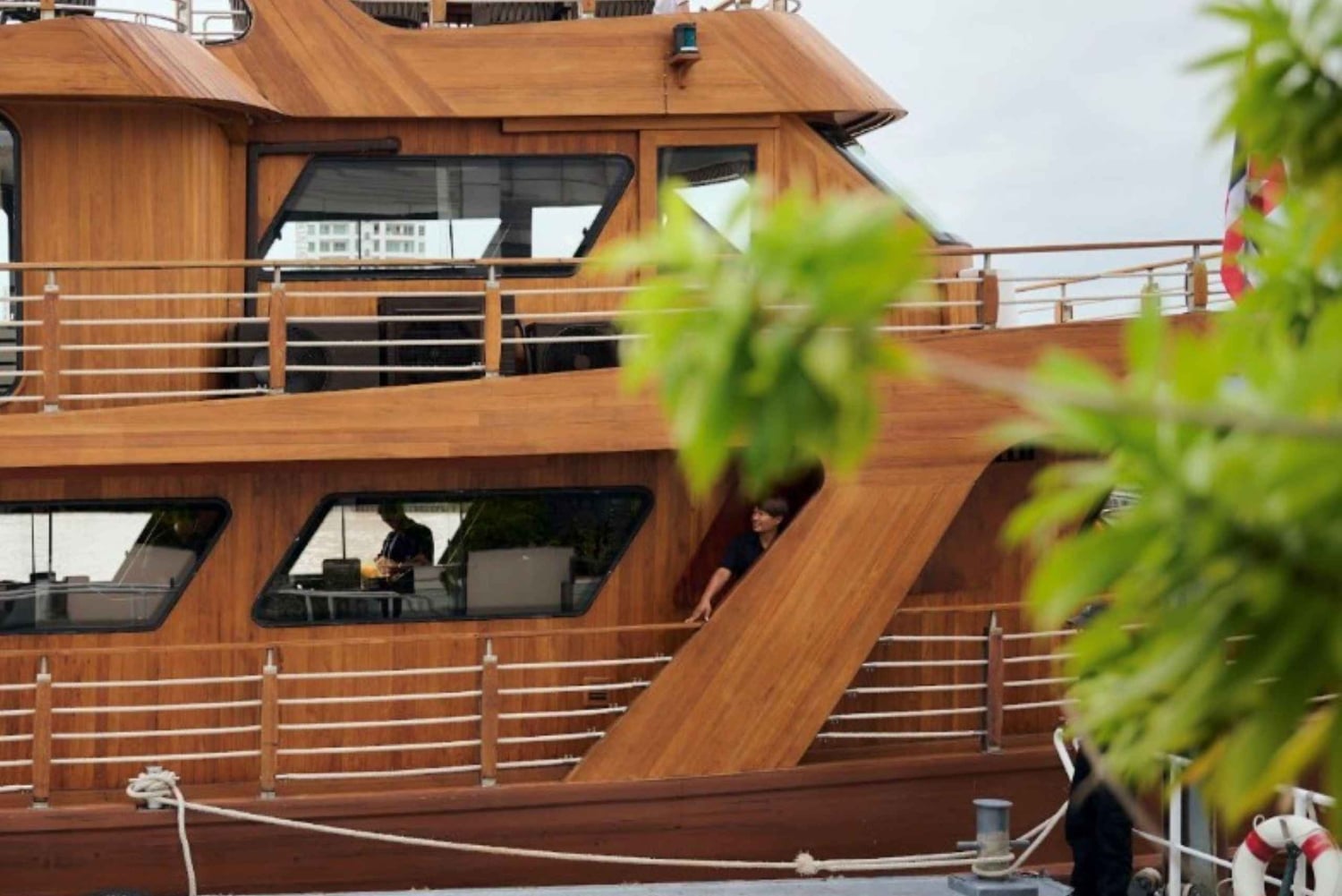 Steige an Bord einer luxuriösen Yacht-Kreuzfahrt auf dem Chao Phraya River in Bangkok. Genieße ein Michelin-Sterne-Erlebnis mit einem 4-Gänge-Thai-Menü, das von einem renommierten Koch zubereitet wird. Genieße Cocktails, Mocktails, Mineralwasser und Softdrinks so viel du willst, während du den atemberaubenden Blick auf den Sonnenuntergang genießt. Beginne deinen Abend mit einem Begrüßungsgetränk aus Piper-Heidsieck-Champagner und Canapés vor dem Abendessen. Fahre an berühmten Sehenswürdigkeiten wie Wat Arun, dem Großen Palast und der Rama-VIII.-Brücke vorbei. Bei hohen Wasserständen kann die Strecke aus Sicherheitsgründen angepasst werden und führt dich in Richtung Rama IX.Includes