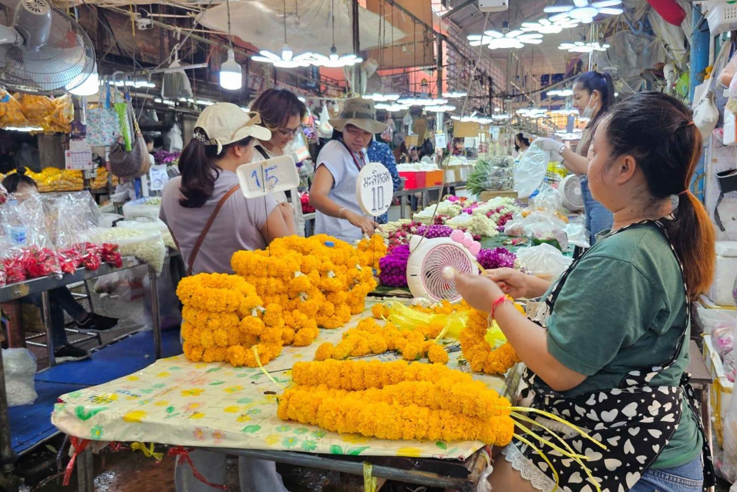 Elektrische Tuk-Tuk Tour durch Bangkok Lokaler englischsprachiger Guide Besuch des Pak Klong Talad: Blumenmarkt Eintrittskarten für Wat Benchamabophit Eintrittskarten für Wat Ractchanadda Vorbeifahrt am Wat Suthat Besuch des Hua Lamphong Bahnhofs Eine Flasche Wasser und ein kleiner SnackImportant Information