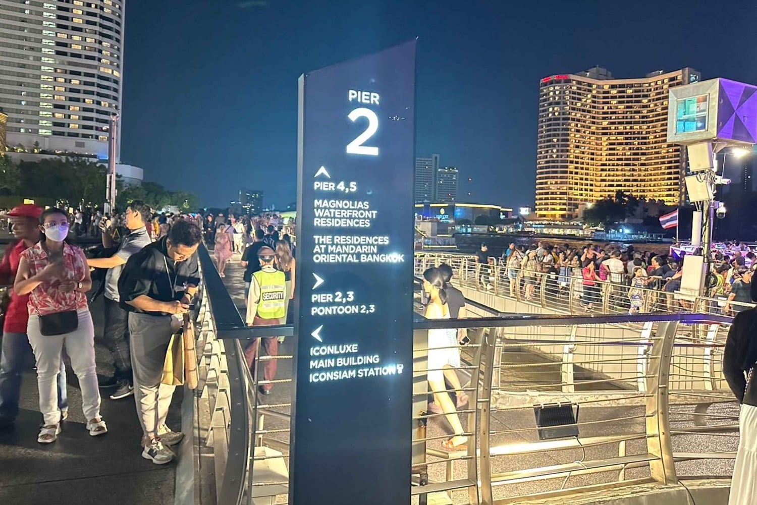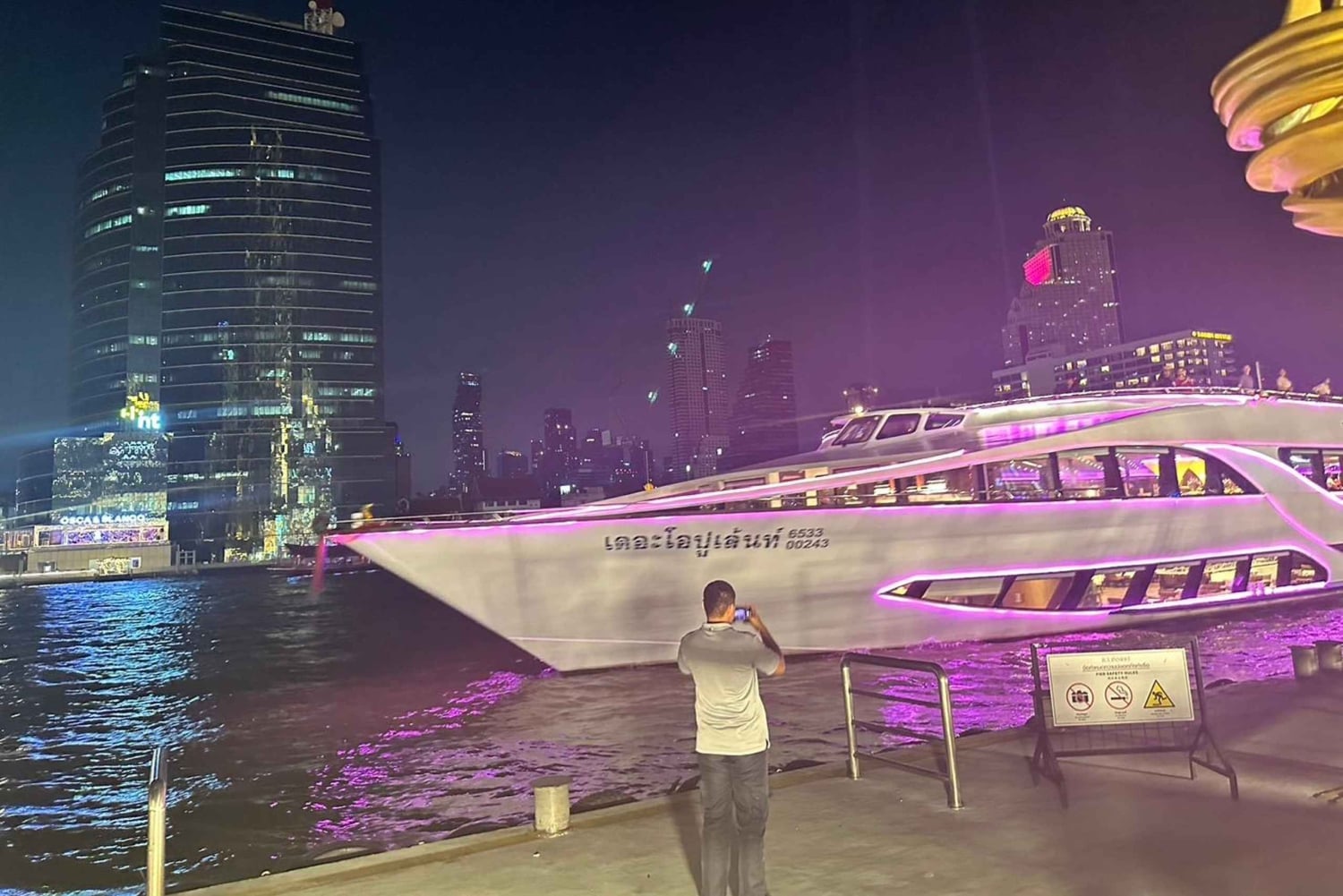 Begib dich auf eine üppige Bangkok-Dinner-Kreuzfahrt, die um 20:00 Uhr vom Icon Siam abfährt, nachdem du um 17:30 Uhr vom Hotel abgeholt worden bist. Gehe an Bord eines luxuriösen Schiffes und genieße einen großartigen Abend mit einem sorgfältig zubereiteten Abendessen, das thailändische und internationale Köstlichkeiten enthält. Genieße ein üppiges Abendessen mit thailändischen und internationalen Köstlichkeiten, während du auf dem Chao Phraya Fluss schipperst. Genieße fesselnde Live-Unterhaltung, während du die schimmernde Skyline der Stadt bewunderst. Genieße Live-Unterhaltung, während du auf dem bezaubernden Chao Phraya Fluss schipperst. Halte die atemberaubende Skyline der Stadt fest, die im Nachthimmel schimmert. Um 22:15 Uhr kehrst du zum ICON Siam Pier zurück und beendest damit ein unvergessliches und opulentes 2-stündiges Dinner Cruise Erlebnis.Includes