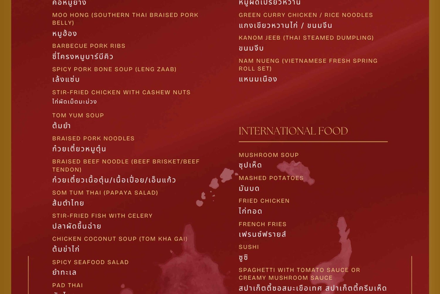 - Buffet tailandés e internacional con cerveza de barril y refrescos ilimitados.