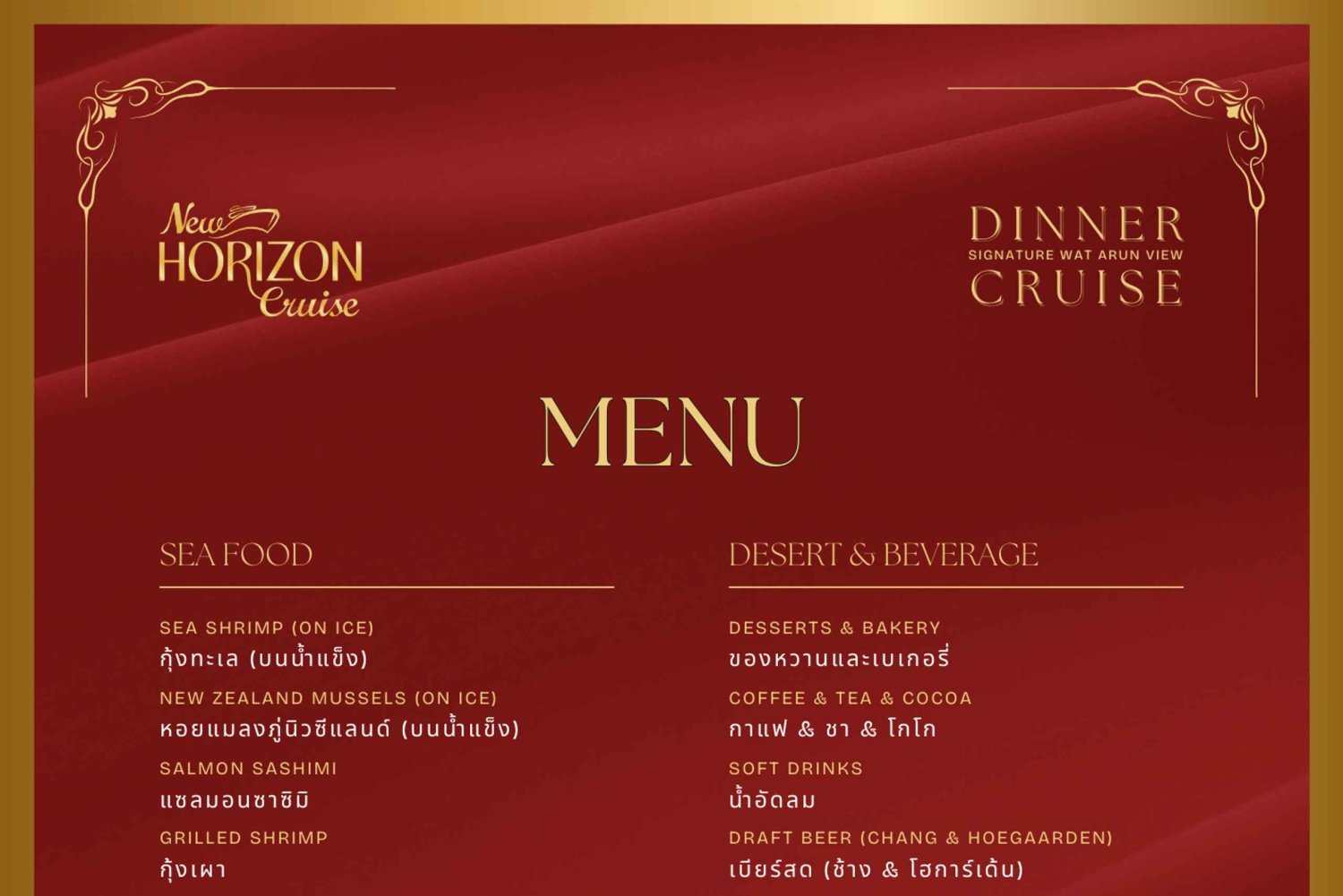 Crucero New Horizon Sube a bordo del crucero con cena New Horizon desde la terminal 21 Rama 3 y descubre una forma realmente diferente de experimentar Bangkok por la noche. A diferencia de los barcos abarrotados, el New Horizon acoge a menos de 120 pasajeros, lo que crea un ambiente espacioso y relajado en el que todos los asientos están diseñados con vistas al río. Desde el momento de tu llegada, nuestro amable personal te recibirá con una cálida hospitalidad y te guiará hasta tu mesa, creando el ambiente perfecto para una velada inolvidable. Cuando el crucero comience su recorrido por el río Chao Phraya, disfruta de un suntuoso bufé con más de 30 platos tailandeses e internacionales. Desde marisco fresco sobre hielo y sushi hasta currys tailandeses clásicos, sabrosos salteados, especialidades a la parrilla y una tentadora selección de postres, hay algo para deleitar todos los paladares. También hay opciones vegetarianas disponibles. Para que tu experiencia sea aún más agradable, se incluye cerveza de barril y refrescos ilimitados, para que tu vaso nunca esté vacío. La música en directo interpretada por talentosos músicos locales se suma al ambiente vibrante y elegante, lo que facilita relajarse y disfrutar del paisaje. Mientras el barco se desliza por los brillantes monumentos de Bangkok, verás el Gran Palacio iluminado, los majestuosos puentes y el resplandeciente horizonte. Lo más destacado de la velada es Wat Arun, el Templo del Amanecer, que brilla con una luz dorada contra el cielo nocturno. A diferencia de otros cruceros, New Horizon se detiene aquí más tiempo, lo que te da tiempo suficiente para disfrutar de la mágica vista y tomar fotos impresionantes sin sentirte apurado. Elige entre disfrutar de la cubierta superior al aire libre con la fresca brisa del río y las vistas panorámicas, o relajarte en el elegante salón comedor interior, donde los ventanales del suelo al techo mantienen el río siempre a la vista. Gracias a su cuidado diseño y atención al detalle, todos los huéspedes pueden disfrutar cómodamente de la belleza de la ribera de Bangkok. Cuando regreses a la Terminal 21 Rama 3, habrás vivido algo más que una cena: una velada elegante, relajante y llena de recuerdos inolvidables. Tanto si estás celebrando una ocasión especial, viajando con la familia o simplemente buscando una forma única de pasar una noche en Bangkok, el crucero con cena New Horizon ofrece la combinación perfecta de buena comida, entretenimiento y paisajes impresionantes. Disfruta de una experiencia premium en el río Chao Phraya, con las mejores vistas de Wat Arun, comida y bebidas excepcionales, y la tranquilidad de saber que has elegido un crucero que realmente destaca.Includes