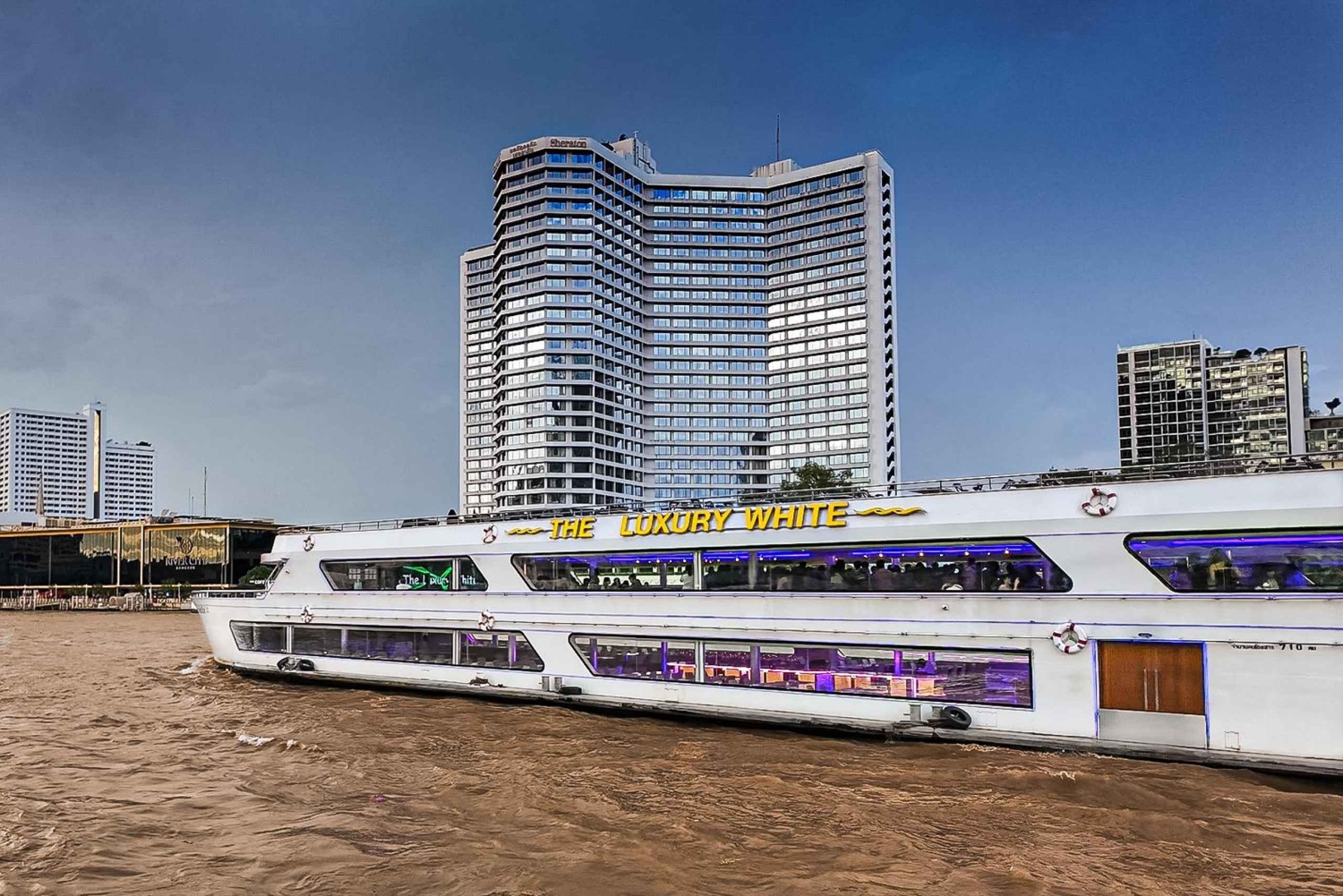 Enjoy a The Luxury White dinner cruise on the Chao Phraya River in Bangkok. Savor a buffet, enjoy unlimited drinks, and take in views of iconic landmarks like Wat Arun and The Grand Palace.