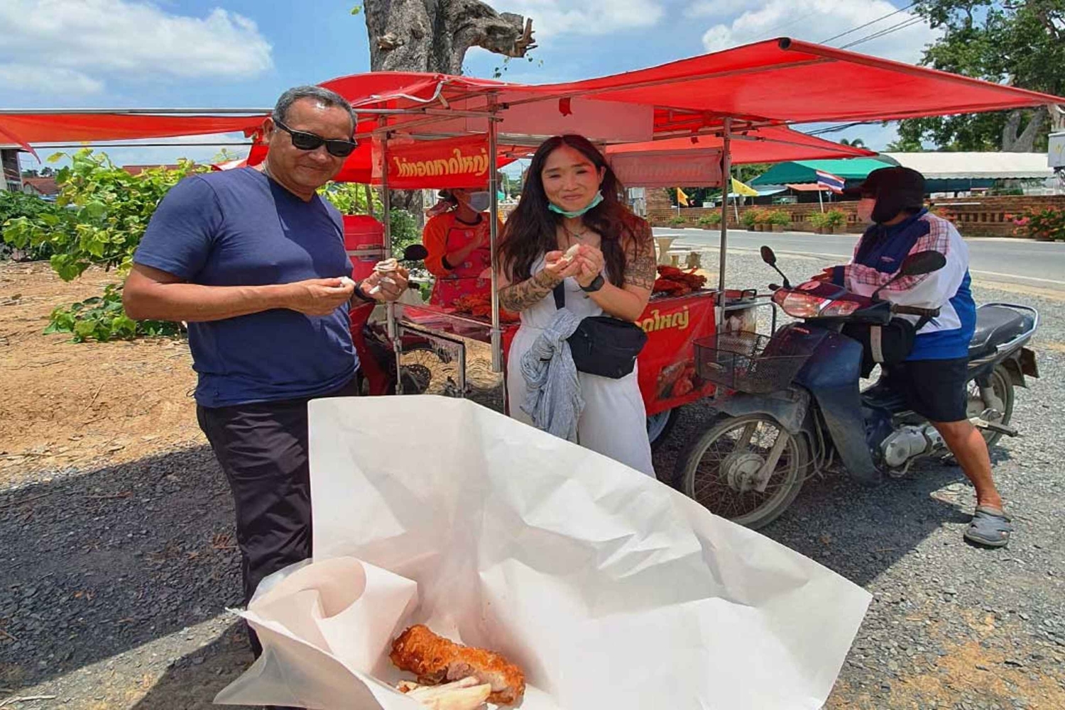 Vieraile kolmessa suuressa temppelissä Ayutthayassa: Wat Mahathat – täällä on kuuluisa puun juuriin kietoutunut Buddhan pää Wat Phra Si Sanphet – entinen kuninkaallinen temppeli, jossa on ikoniset kolmoispagodit Wat Chai Watthanaram – uskomaton joenrantatemppeleitä, jossa on khmer-tyylistä arkkitehtuuria ja joka on täydellinen valokuviin Aito thai-lounas Nauti paikallisista ruokalajeista, kuten grillatuista jokikatkaravusta – Ayutthayan pakkoherkusta. Paikallisten jälkiruokien maistelu Kokeile Ayutthayan suosittua makeaa herkkua: Roti Sai Mai (thaihattara). Venematka saarekaupungin ympäri Rentoudu luonnonkauniilla risteilyllä joen varrella ja näe paikallista elämää vedestä käsin, mukaan lukien paikka, jossa voit nähdä norsuja kylvemässä joen rannalla.Includes