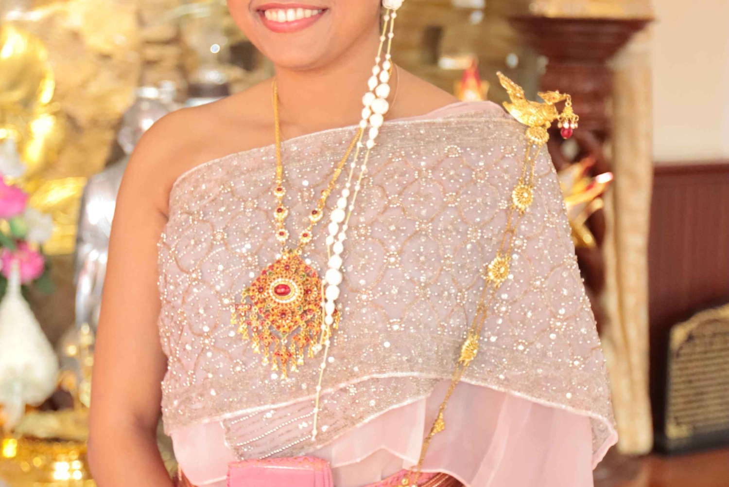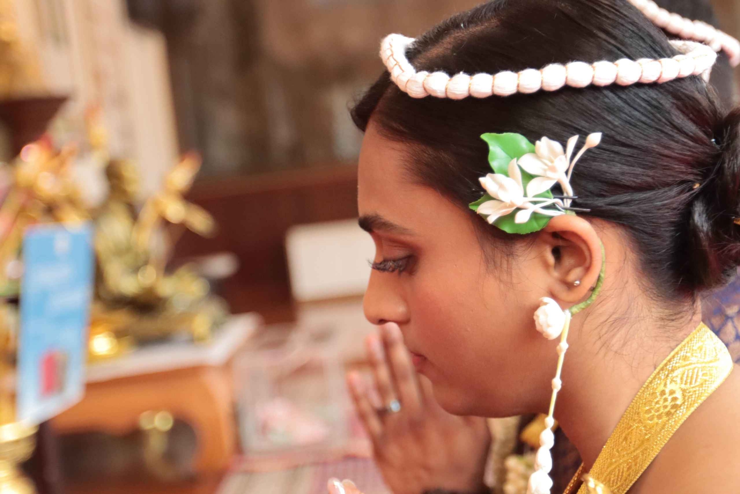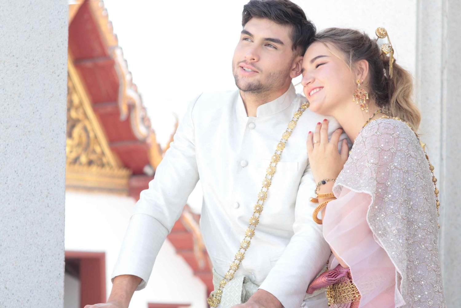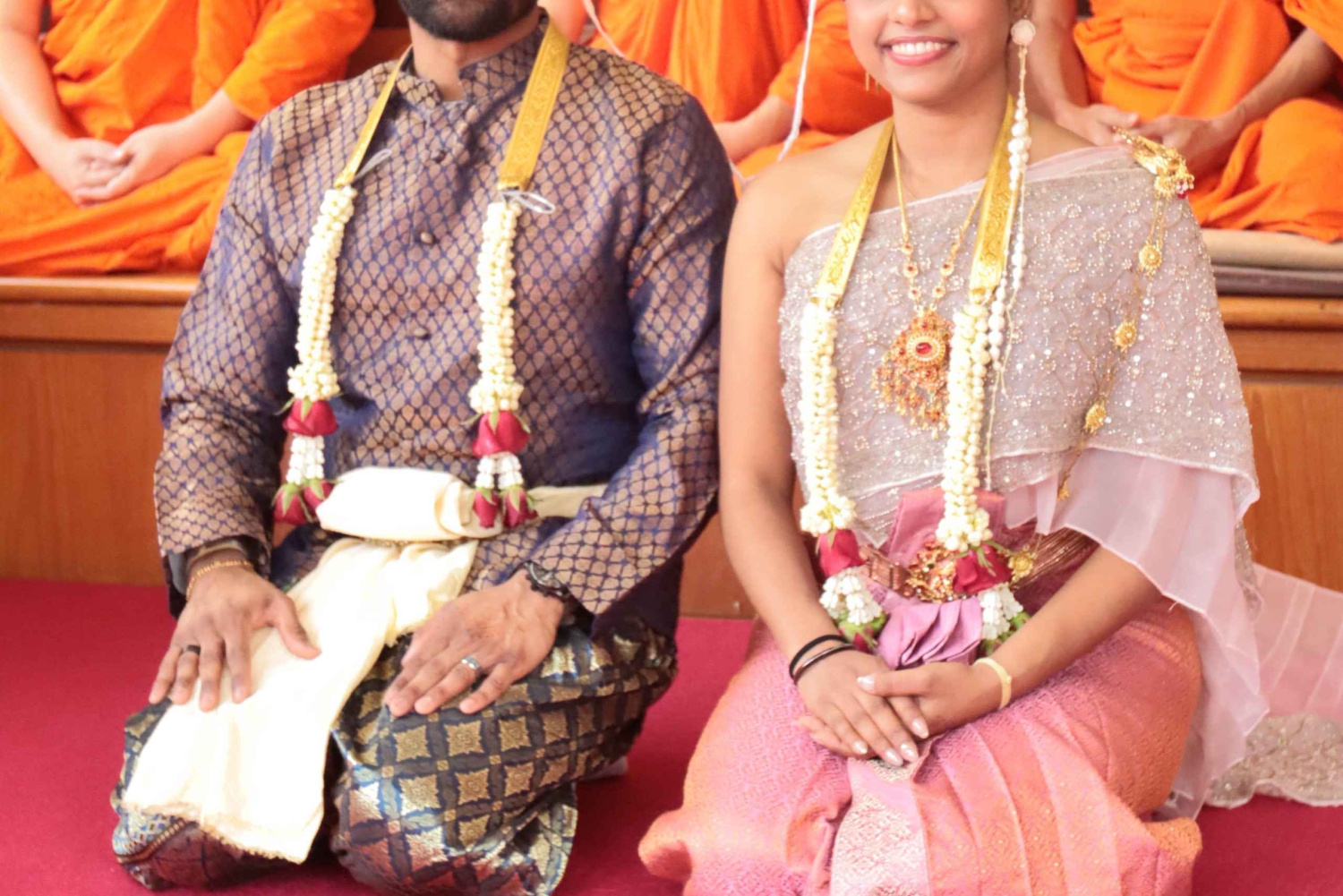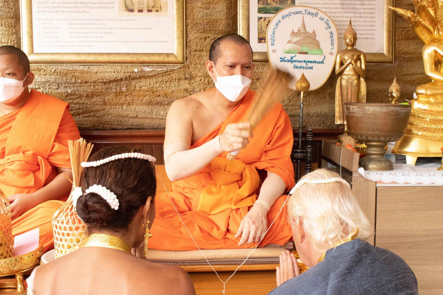 Koe aito buddhalainen hääseremonia kauniissa thaimaalaisessa temppelissä. Ota vastaan pyhän munkin siunaukset ja osallistu perinteiseen thaimaalaiseen hääseremoniaan. Hääseremonia on buddhalaisille hyvin tärkeä. Seremonian tarkoituksena on toivottaa hääparille onnellista elämää. Kihlapari sytyttää suitsukkeita ja kynttilöitä ja rukoilee. Sitten munkit pitävät lukulauseita ja siunaavat vettä seremoniaa varten. Kun hääpari on antanut ruokaa ja uhrilahjoja munkille, munkit rukoilevat ja ripottelevat pyhää vettä tuomaan onnea hääparille. Seremonian jälkeen voit osallistua valokuvaukseen temppelin ympäristössä.Includes