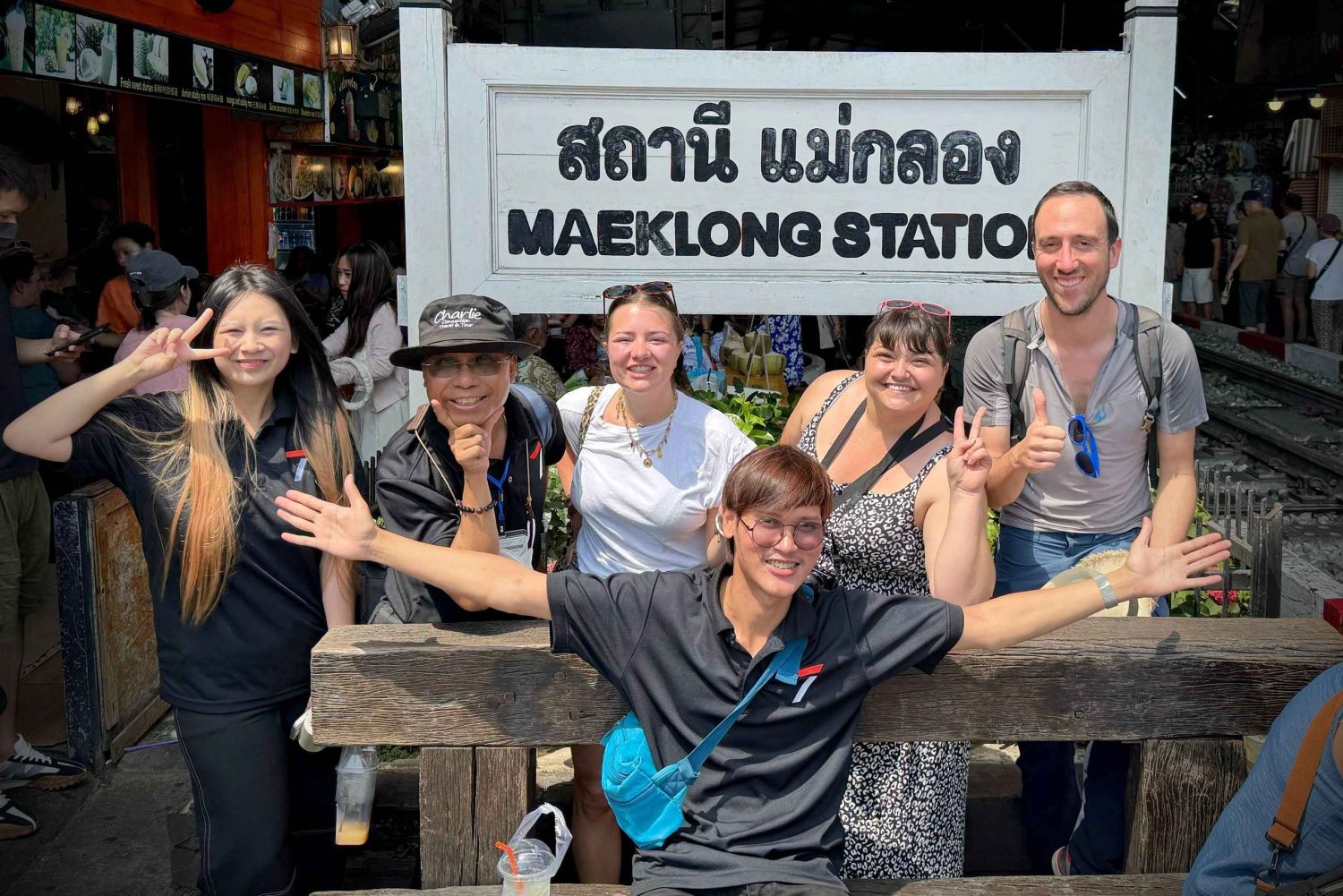 Assurance accident Trajet en train à travers le marché ferroviaire de Maeklong Tour en bateau à longue queue à travers le marché flottant de Damnoen Saduak Guide anglophone agréé Audioguide en 28 languesImportant Information