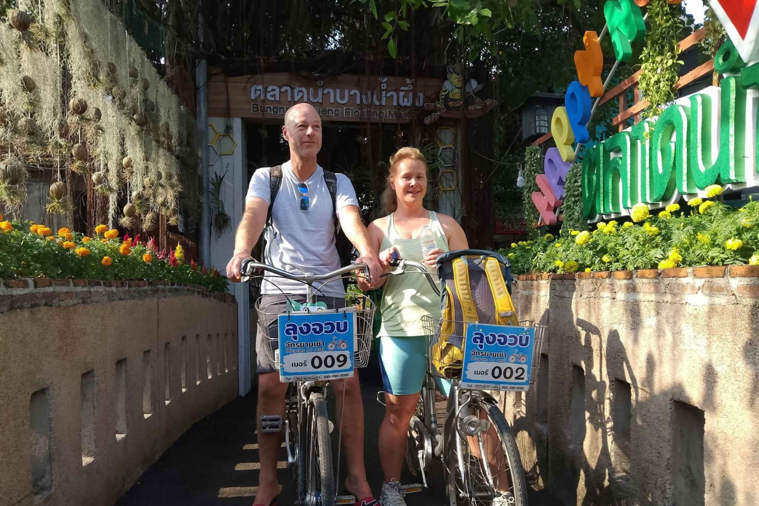 Scopri il 'polmone verde' di Bangkok con un tour in bicicletta di Bang Kachao. Prendi un traghetto per attraversare il fiume Chao Phraya ed esplora il verde lussureggiante dell'isola e le comunità locali. Incontra la tua guida al molo di Wat Bangna Nok e prendi un traghetto per attraversare il fiume Chao Phraya fino a Bang Kachao. Inizia a pedalare verso la strada locale all'ombra degli alberi. Esplora e scatta una foto al Parco Sri Nakorn Khuen Khan. Percorri un sentiero sopraelevato e zigzaga tra le comunità per vedere la vita locale. Goditi il verde lussureggiante del 'polmone verde' di Bangkok.Includes