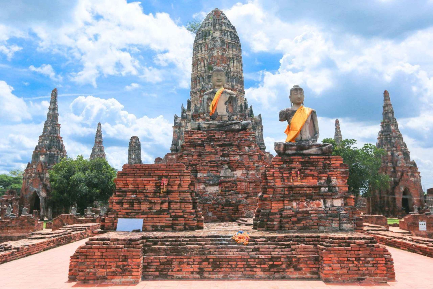 ホテルからのストレスフリーなピックアップで一日をスタートします。ガイドがアユタヤの歴史について興味深い解説をしながら、プライベートでエアコン完備の車両で北へ向かう景色の良いドライブをお楽しみください。ワット・チャイ・モンコンの整然とした庭園を散策し、その高いチェディに登ります。かつては僧侶の修道院だったこの寺院は、パノラマビューとアユタヤの精神的な過去への穏やかな導入を提供します。 アユタヤで最も象徴的な光景である、木の根に絡み合った仏頭が安置されるワット・マハタートを訪れます。雰囲気漂う遺跡を散策し、この寺院がかつて仏陀の聖遺物を守っていた歴史を学びます。アユタヤ王宮複合施設内の元王宮寺院であるワット・プラ・シー・サンペットで、王たちが祈りを捧げた場所に立ちます。3つの壮麗なチェディを鑑賞し、古代の王室儀式が執り行われた壮麗な光景を想像してください。 ワット・ロカヤスッタの37メートルに及ぶ横たわる仏像の静かな存在感に包まれましょう。寺院の崩れかけた残骸の中に平和に眠るこの仏像は、瞑想や絶景の写真を撮影する理想的なスポットです。 旅の最後を飾るのは、クメール建築をモチーフにした川沿いの傑作、ワット・チャイワッタナーラムです。対称的な尖塔とドラマチックなシルエットが、アユタヤで最も写真映えするスポットの一つに夕日が黄金色に染める光景に、感嘆の声を上げることでしょう。帰路の途中、ガイドがアユタヤの興亡の物語を語りながら、リラックスした時間を過ごしてください。Includes