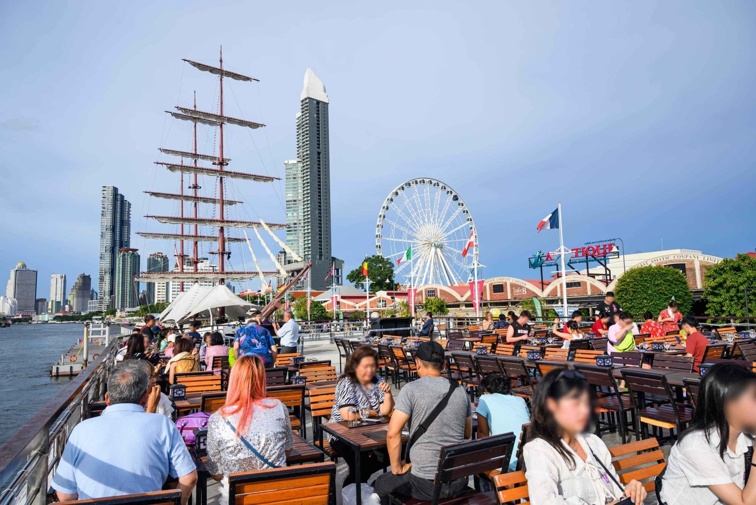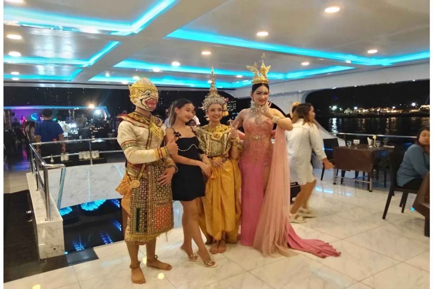 バンコクのリバークルーズは、アジアティーク・ザ・リバーフロントの集合場所でチェックインして始まります。エレガントなホワイトオーキッドクルーズ船にご乗船いただき、チャオプラヤ川に沿って出発するクルーズでウェルカムドリンクをお楽しみください。旅の始まりに、古典的なタイのダンスパフォーマンスをお楽しみください。魅惑的な夜の雰囲気を味わっていただけます。 川沿いをクルーズしながら、夜にライトアップされたバンコクの有名な名所の数々をご覧ください。王宮、ワット・ポー(涅槃寺)、ワット・アルン(暁の寺)など、数多くの名所が夜の景色を彩ります。これらの見事な名所は、思い出に残る夜の舞台として最適です。 伝統的なタイ料理から西洋料理まで、さまざまな美味しい料理を取り揃えたビュッフェ式ディナーをお楽しみください。さらに、食後のデザートもお楽しみいただけます。食事中は、音楽の生演奏と魅力的なキャバレーショーをお楽しみいただけます。 夕食後は、屋外デッキでリラックスしながら、夜のバンコクの360度の景色をお楽しみください。川に映る街の灯りが魔法のような雰囲気を演出します。アジアティーク・ザ・リバーフロントに到着してクルーズを終え、バンコクの夜をお楽しみください。 バンコクのホワイトオーキッドディナークルーズを今すぐご予約ください。チャオプラヤ川の穏やかな水面から、街の夜の美しさをお楽しみいただけます。ホテル移動サービスをご利用いただけますので、ご都合に合わせてご利用いただけます。Includes
