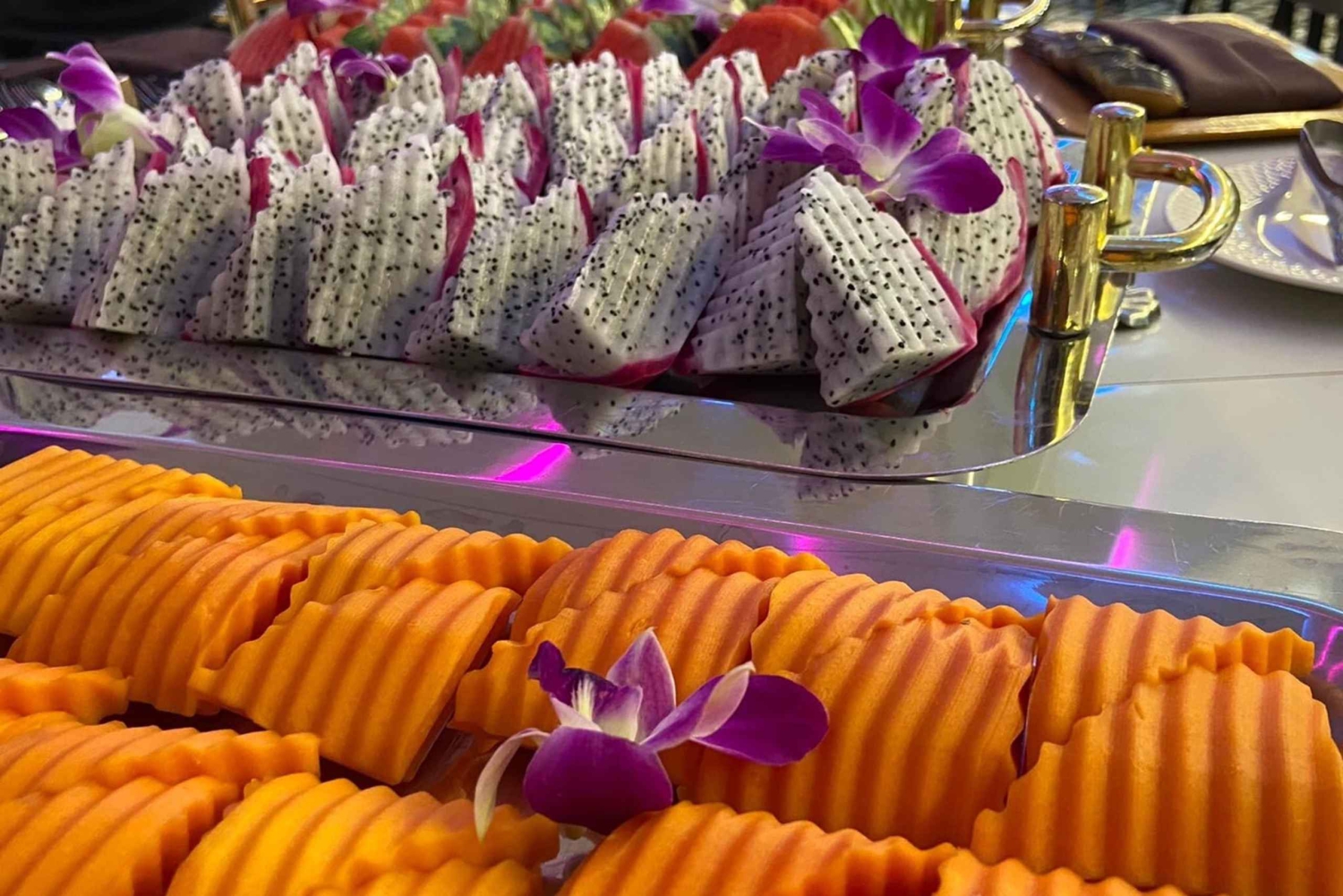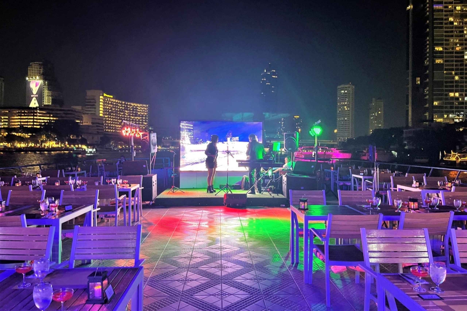 Nyt en minneverdig kveld med utsikt over byens skyline, deilig ubegrenset mat og tradisjonell musikk på dette nattcruise på Chao Phraya-elven. Seil forbi ikoniske landemerker som Icon Siam, Royal Temple og Grand Palace. Gå fra kjøpesenteret Icon Siam og slapp av mens du nyter en fantastisk utsikt over Bangkoks skyline opplyst av nattehimmelen. Lytt til musikk fra et live-band, og syng og dans hele natten til ditt hjerte. Etterpå kan du sette deg ned til en deilig ubegrenset buffé med thailandsk og internasjonal mat. Avslutt cruiset ditt ved å gå til de ytre dekkene for å nyte utsikten over den gamle og nye byen.Includes