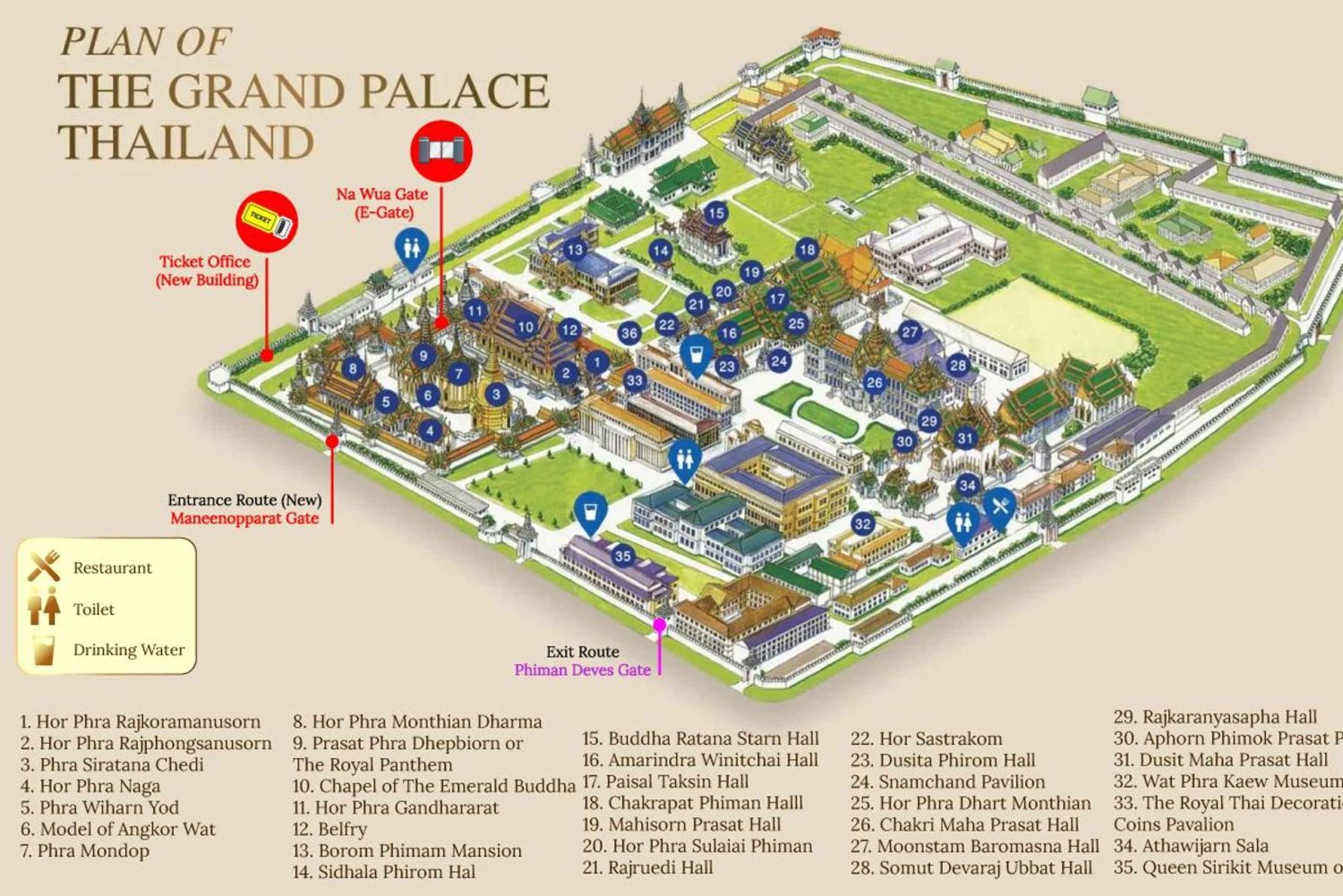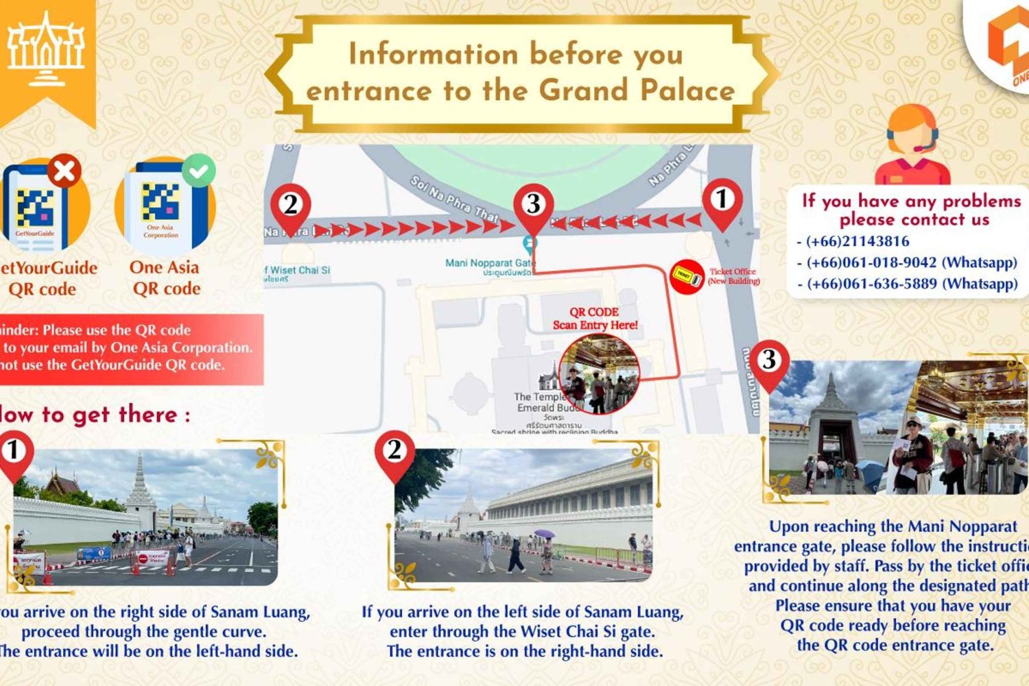 - Det er strenge klesregler i Grand Palace og Wat Phra Kaew. Alle menn må ha lange bukser og skjorter med ermer. Kvinner må ha lange skjørt eller lange bukser som dekker knærne. Tettsittende leggings, gjennomsiktige klær eller revne bukser er ikke tillatt. Skuldrene må være dekket. Det er ikke tillatt å fly drone over området rundt Grand Palace. Dronning Sirikit Tekstilmuseum er åpent daglig fra kl. 09.00 til 16.30. Siste inngang er kl. 15.30. Kunstmuseet er åpent onsdag til søndag fra kl. 10.00 til 15.30. Khon-forestillinger på Sala Chalermkrung Royal holdes mandag til fredag kl. 13.00, 14.30 og 16.00. Barn under 120 cm har gratis adgang. Vær oppmerksom på at det er et bookingsgebyr på 150 THB som allerede er inkludert i prisen for billetter uten kø. Vær oppmerksom på: GetYourGuide-kupongen er ikke din inngangsbillett til Grand Palace. En separat QR-kode-billett vil bli sendt til din e-post. Hvis du ikke mottar den, vennligst kontakt oss for hjelp.