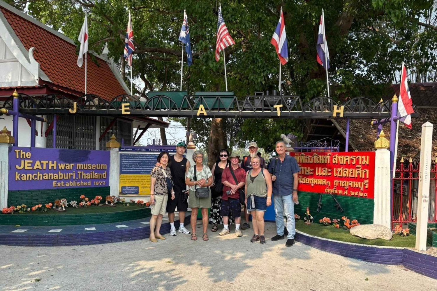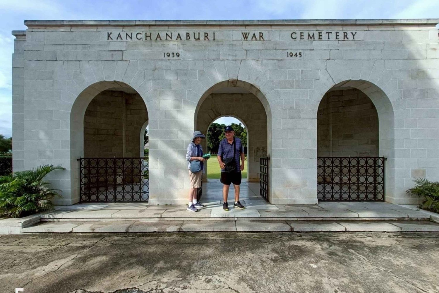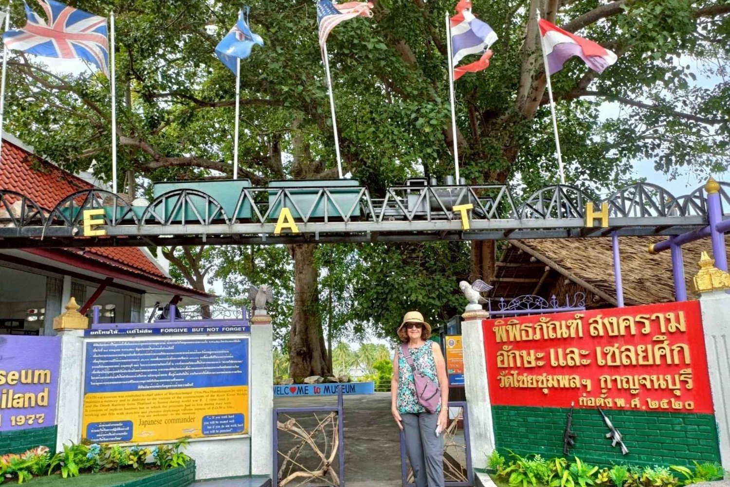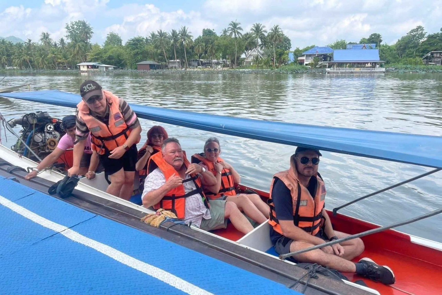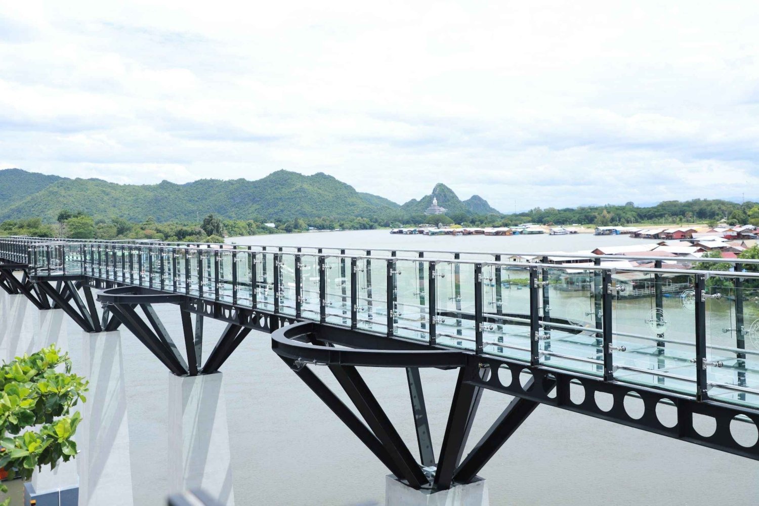 Discover Kanchanaburi an Exclusive Private Tour, War Cemetery, JEATH War Museum, glide along on a longtail boat to Khao Poon Cave, Panoramic views Sky Walk, and unwind The Village Farm Café.