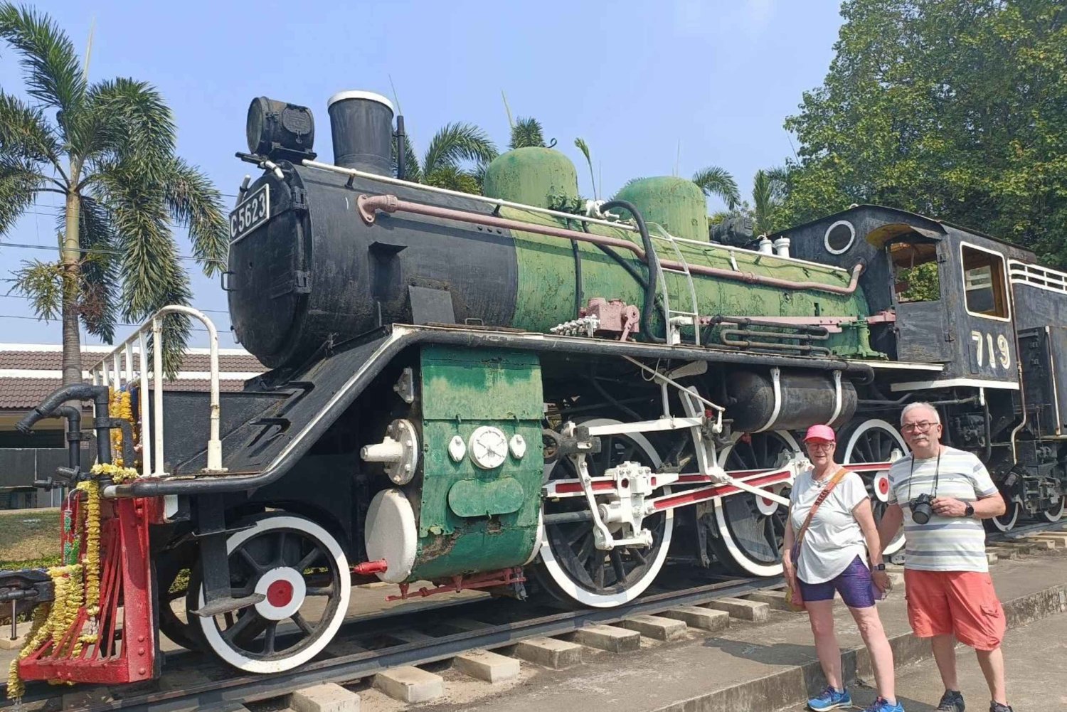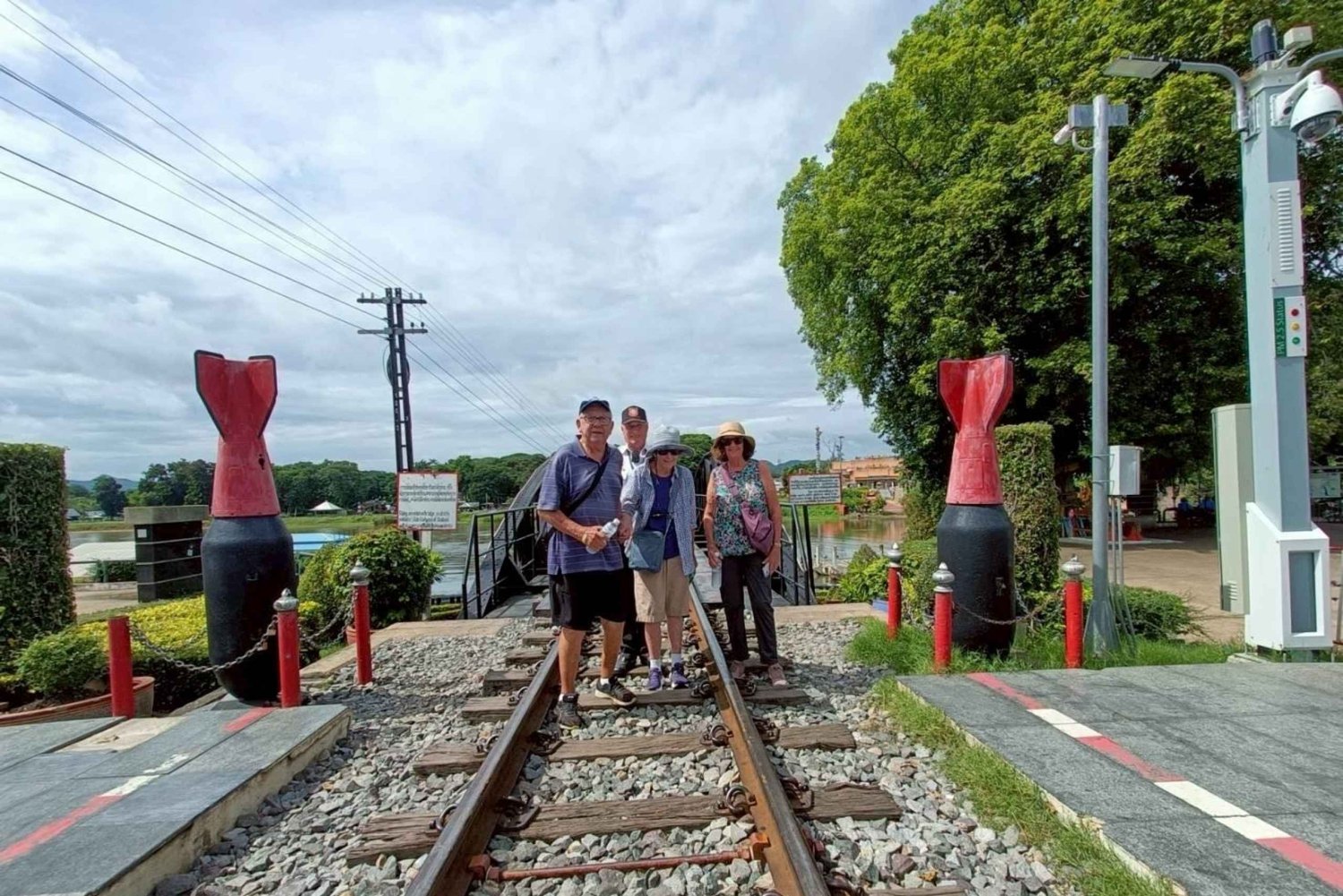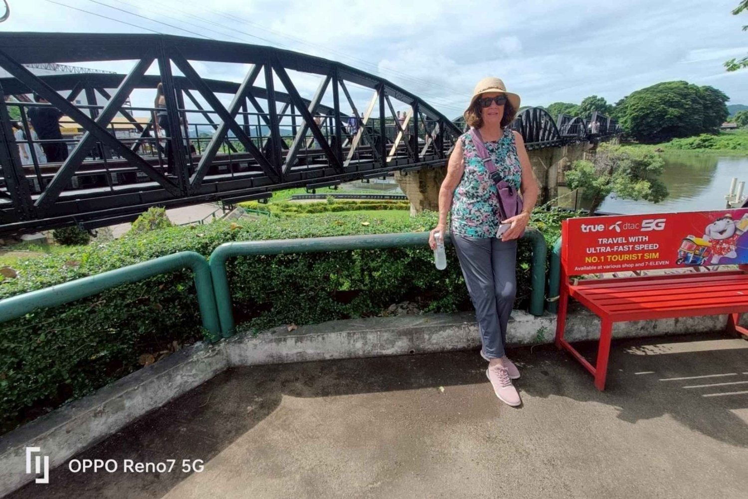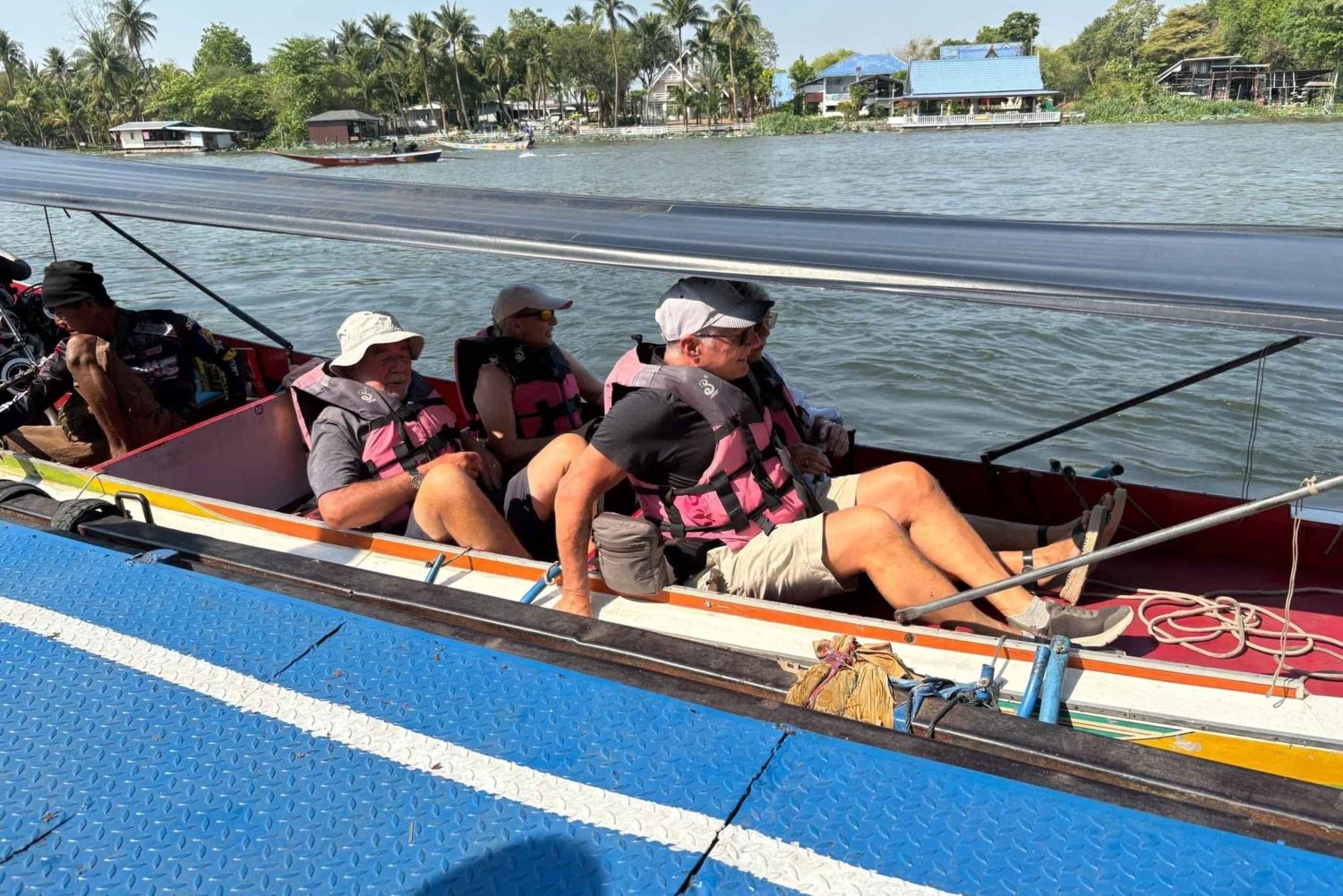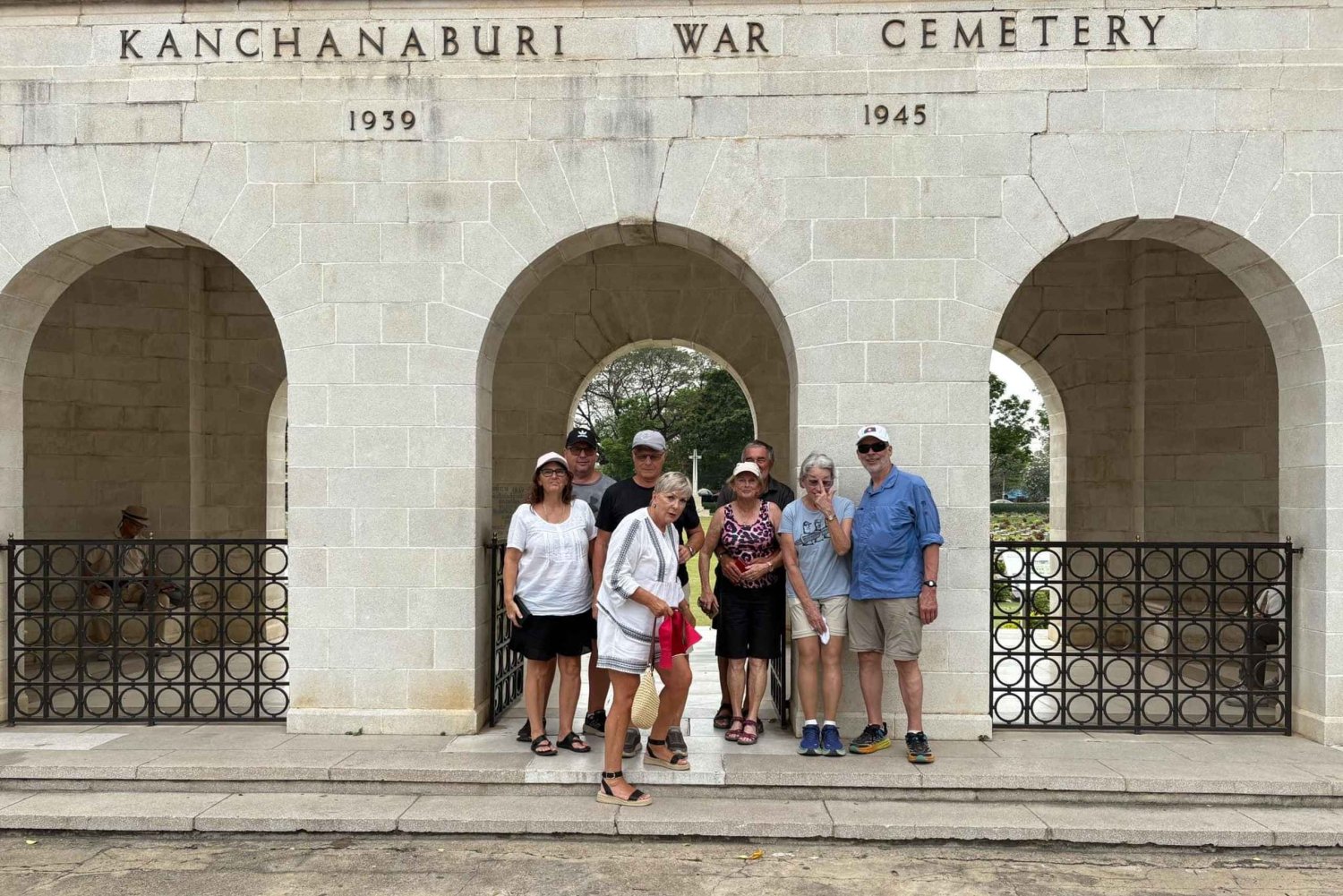 Discover Kanchanaburi an Exclusive Private Tour, War Cemetery, JEATH War Museum, glide along on a longtail boat to Khao Poon Cave, Panoramic views Sky Walk, and unwind The Village Farm Café.