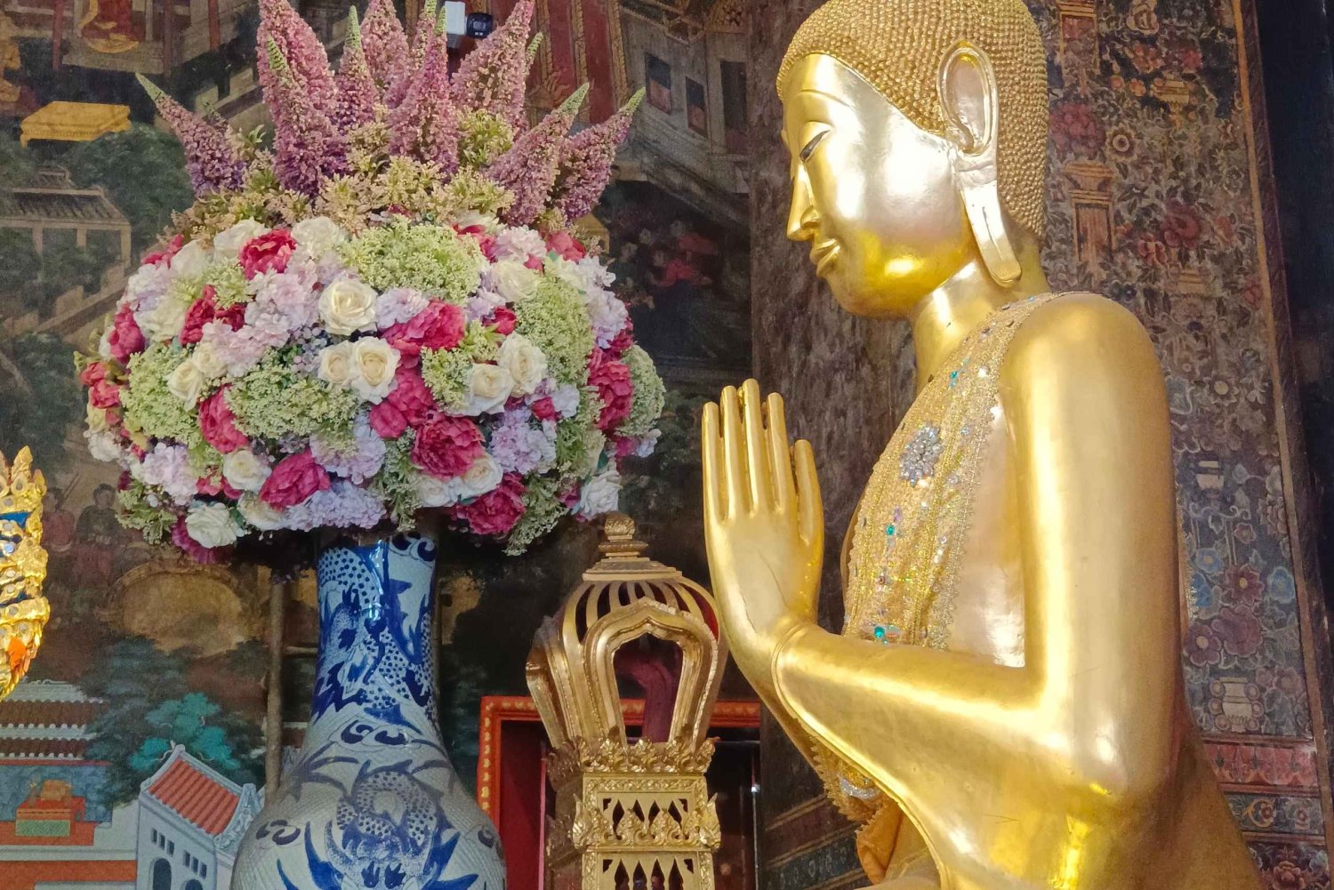 Depois de nos encontrarmos no ponto de encontro na estação de MRT Sanamchai Como seu especialista local, vou te levar numa viagem cultural que começa no vibrante Mercado de Flores de Bangkok, onde vamos explorar as barracas coloridas e escolher flores frescas. Vais criar o teu próprio arranjo de flores ao estilo tailandês, seguido pela preparação do teu próprio conjunto de oferendas – uma bela maneira de experimentar as tradições tailandesas em primeira mão. Depois, vamos atravessar o rio para visitar um templo tranquilo e não turÃstico, escondido num bairro calmo, onde você vai receber uma bênção de um monge. Vou te mostrar os destaques escondidos do templo antes de passearmos por uma comunidade portuguesa-tailandesa cheia de charme e história. Para completar o dia, vamos parar num grande Buda majestoso noutro templo real por perto, onde você vai ver o grande Buda que presta respeito naquela área, antes de voltar ao nosso ponto de encontro com o coração cheio e memórias criadas. É aqui que você pode aprender o jeito certo do budismo tailandês.Includes