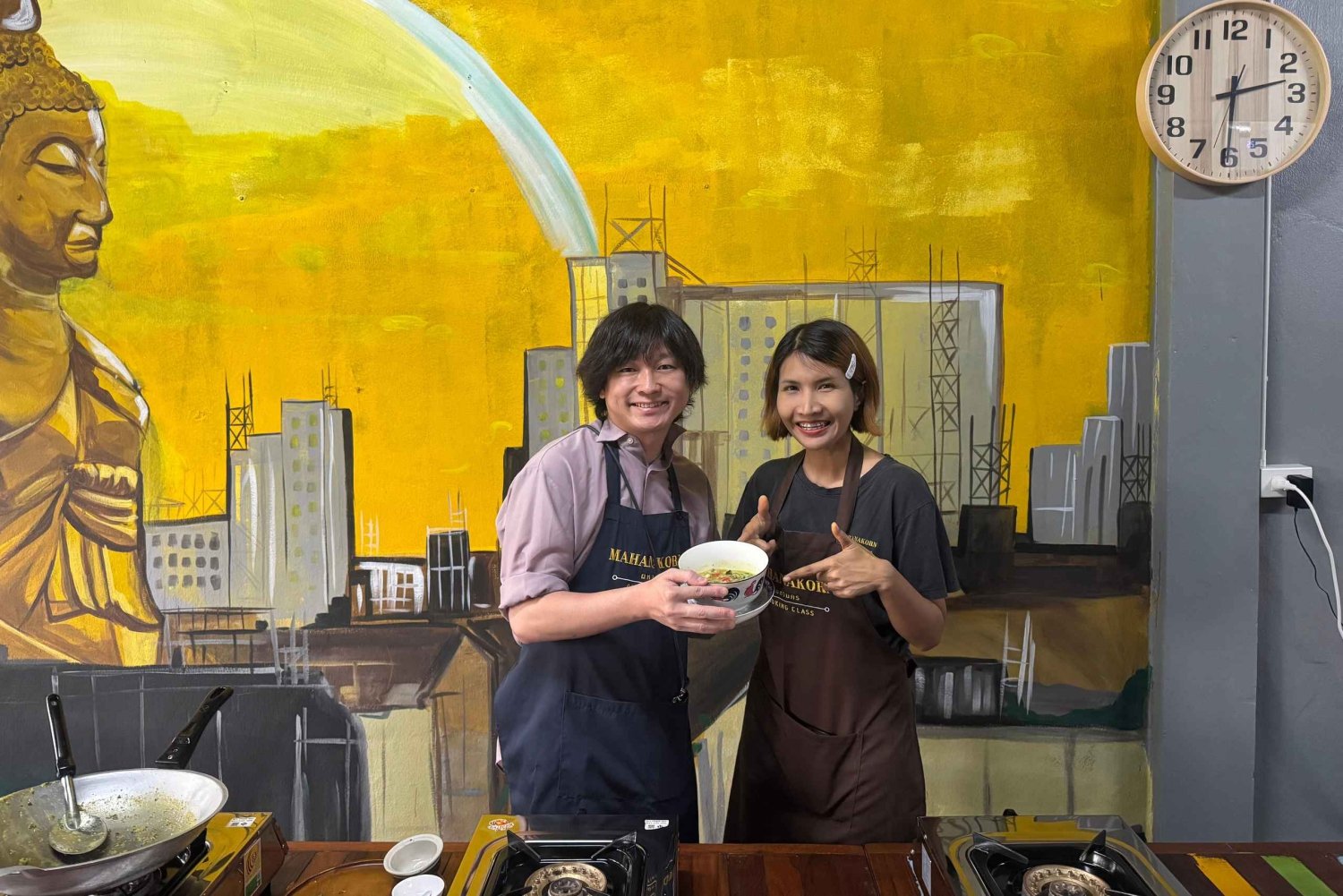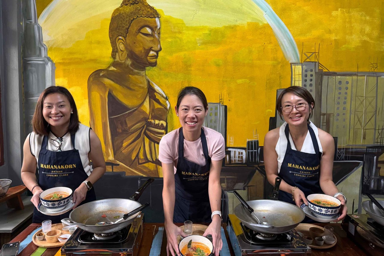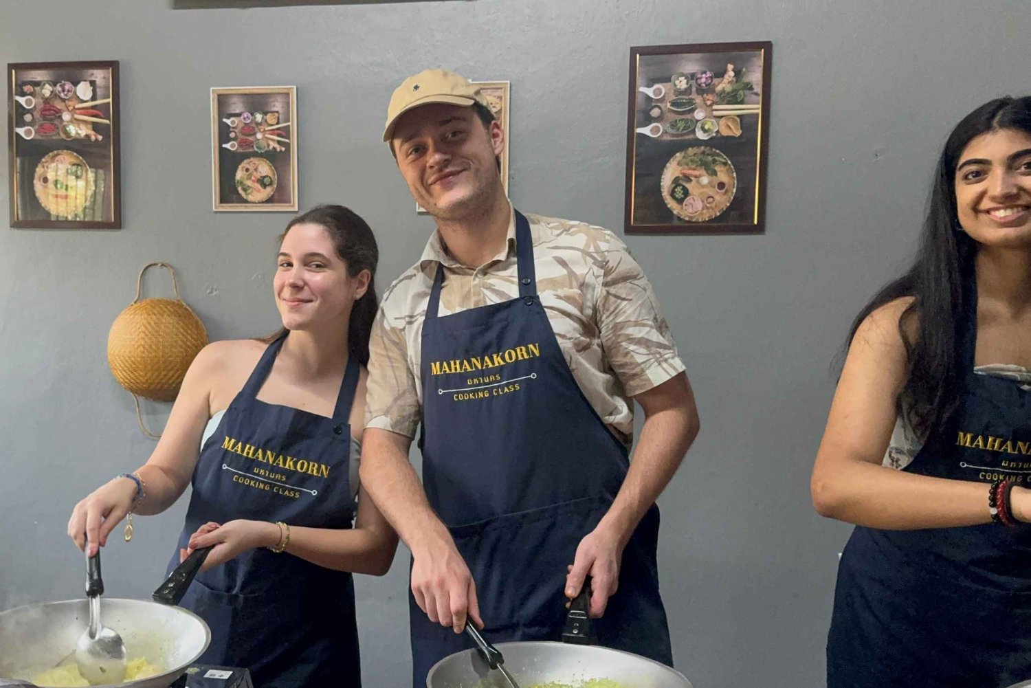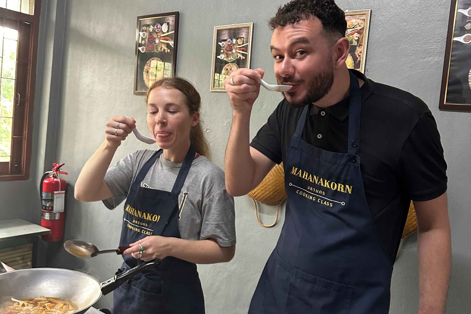 Gå med i en matlagningskurs i Bangkok och lär dig att skapa autentiska thailändska rätter med färska, lokala ingredienser. Börja på Mahanakorn Thai matlagningskurs, där du får en introduktion till de unika kryddorna och smakerna i det thailändska köket. Få praktisk erfarenhet av att laga traditionella recept under ledning av en lokal kock. Från curryrätter till wokrätter får du lära dig tekniker som framhäver Thailands livfulla och djärva smaker. Slutligen sätter ni er ner tillsammans för att njuta av den utsökta måltid ni har tillagat. Oavsett om du är nybörjare eller matentusiast erbjuder denna klass en rolig, kulturell upplevelse som ger dig nya färdigheter och en djupare uppskattning för thailändsk matlagning.Includes