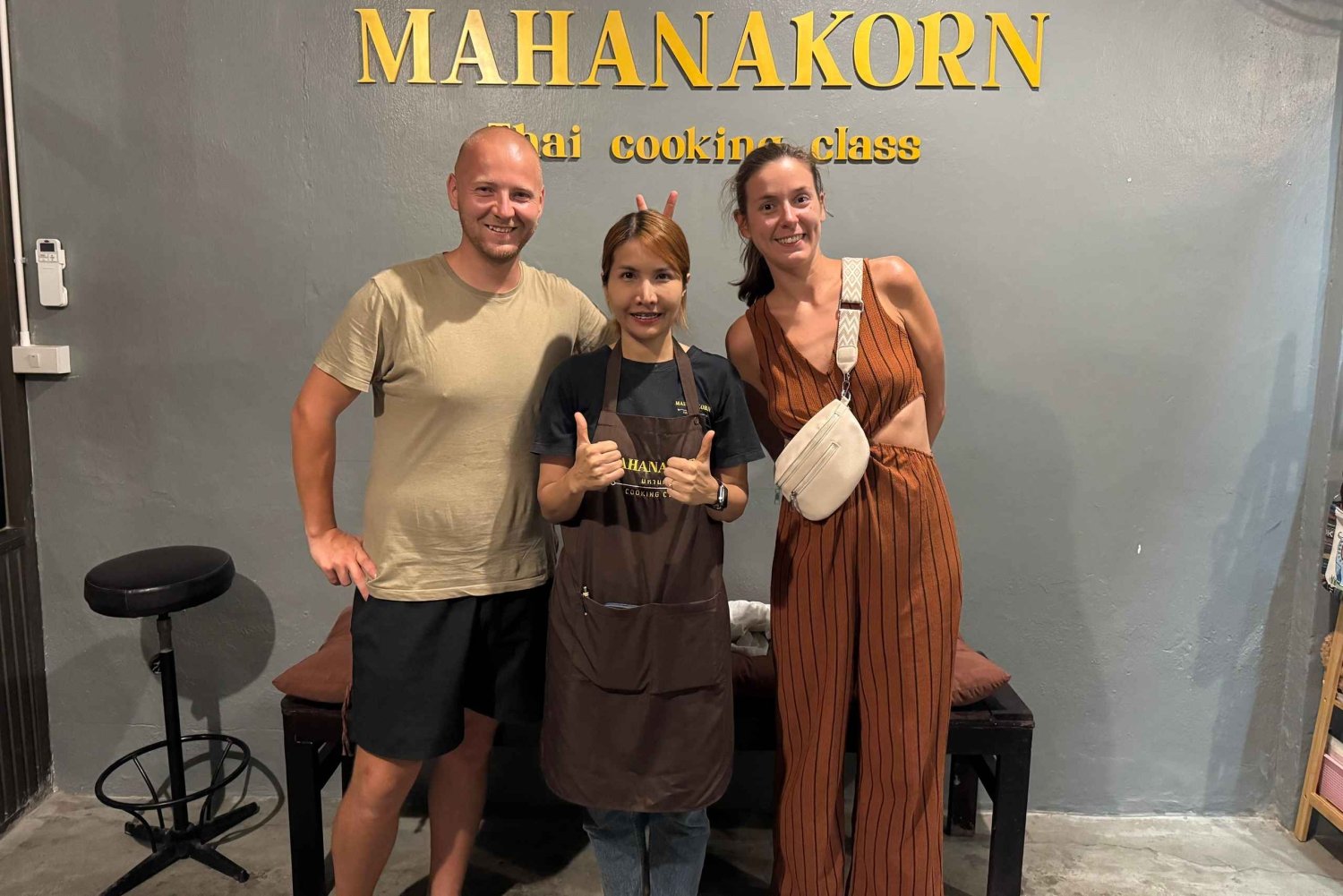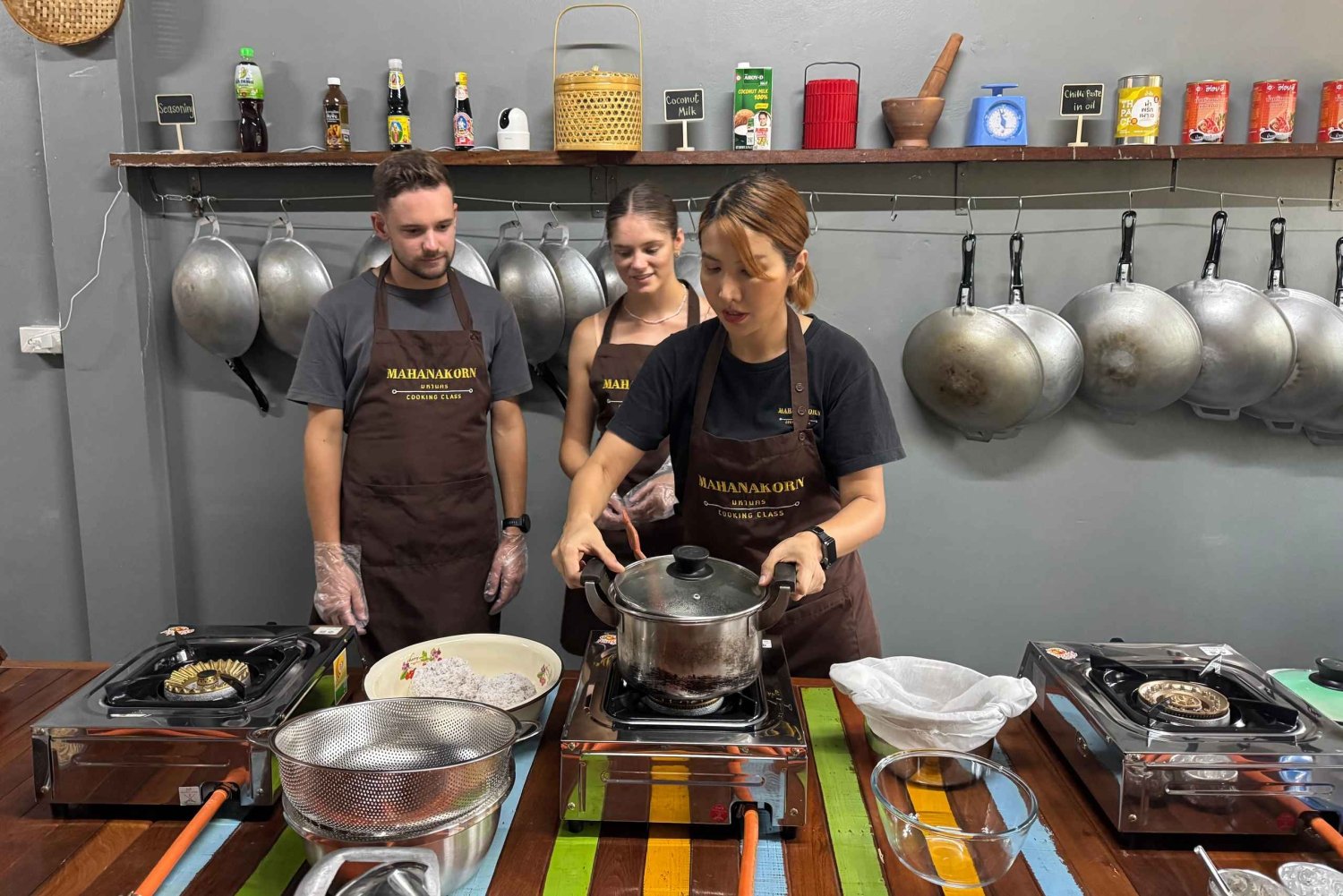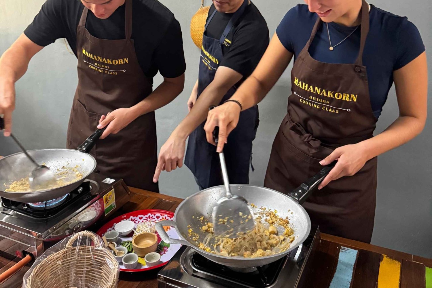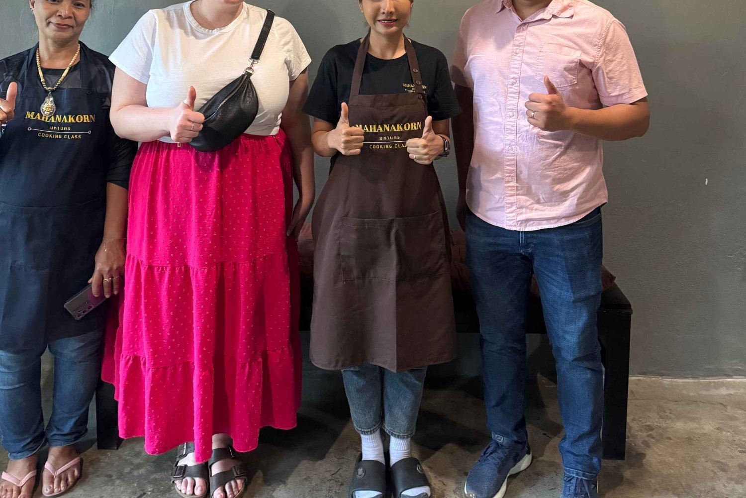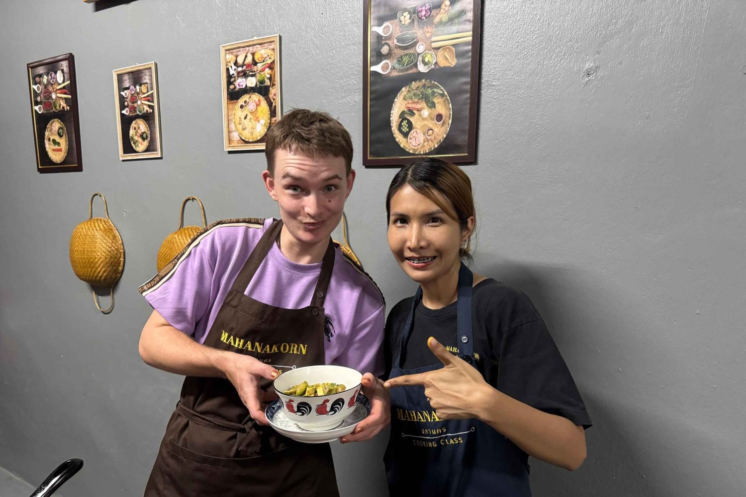 Gå med i en matlagningskurs i Bangkok och lär dig att skapa autentiska thailändska rätter med färska, lokala ingredienser. Börja på Mahanakorn Thai matlagningskurs, där du får en introduktion till de unika kryddorna och smakerna i det thailändska köket. Få praktisk erfarenhet av att laga traditionella recept under ledning av en lokal kock. Från curryrätter till wokrätter får du lära dig tekniker som framhäver Thailands livfulla och djärva smaker. Slutligen sätter ni er ner tillsammans för att njuta av den utsökta måltid ni har tillagat. Oavsett om du är nybörjare eller matentusiast erbjuder denna klass en rolig, kulturell upplevelse som ger dig nya färdigheter och en djupare uppskattning för thailändsk matlagning.Includes