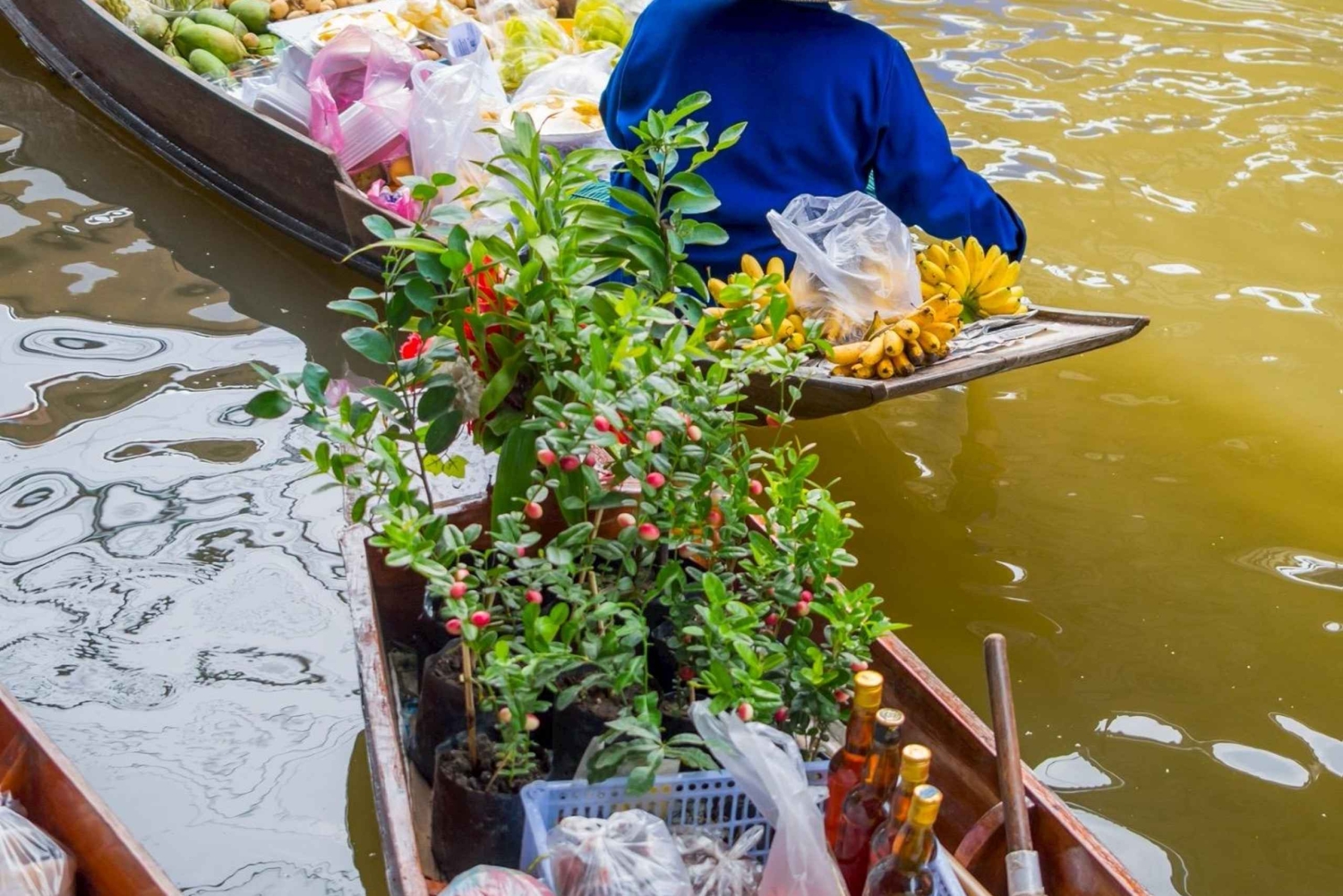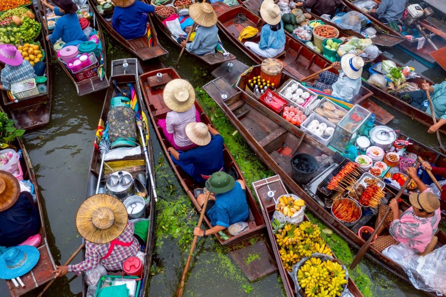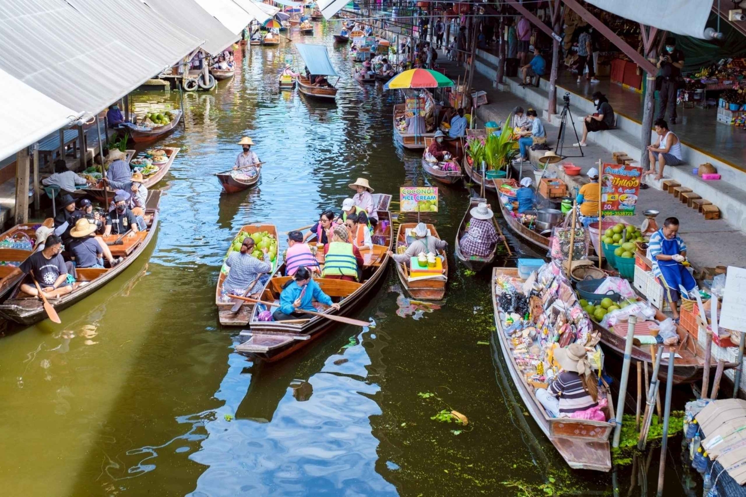 Upptäck Thailands ikoniska marknader på en halvdagstur från Bangkok. Besök Maeklong järnvägsmarknad, åk båt genom Damnoen Saduak flytande marknad och njut av en naturskön utsiktsplats.