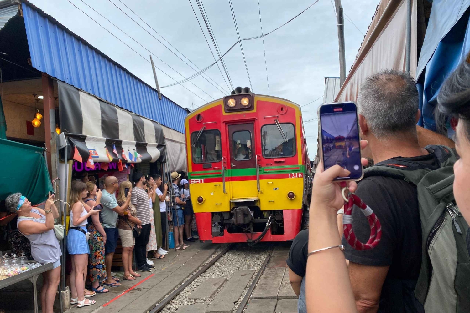 Besök Maeklongs järnvägsmarknad Besök Damnoen Saduak flytande marknad Traditionell åktur med paddelbåt 360-graders utsikt över Mae Klong-flodenImportant Information