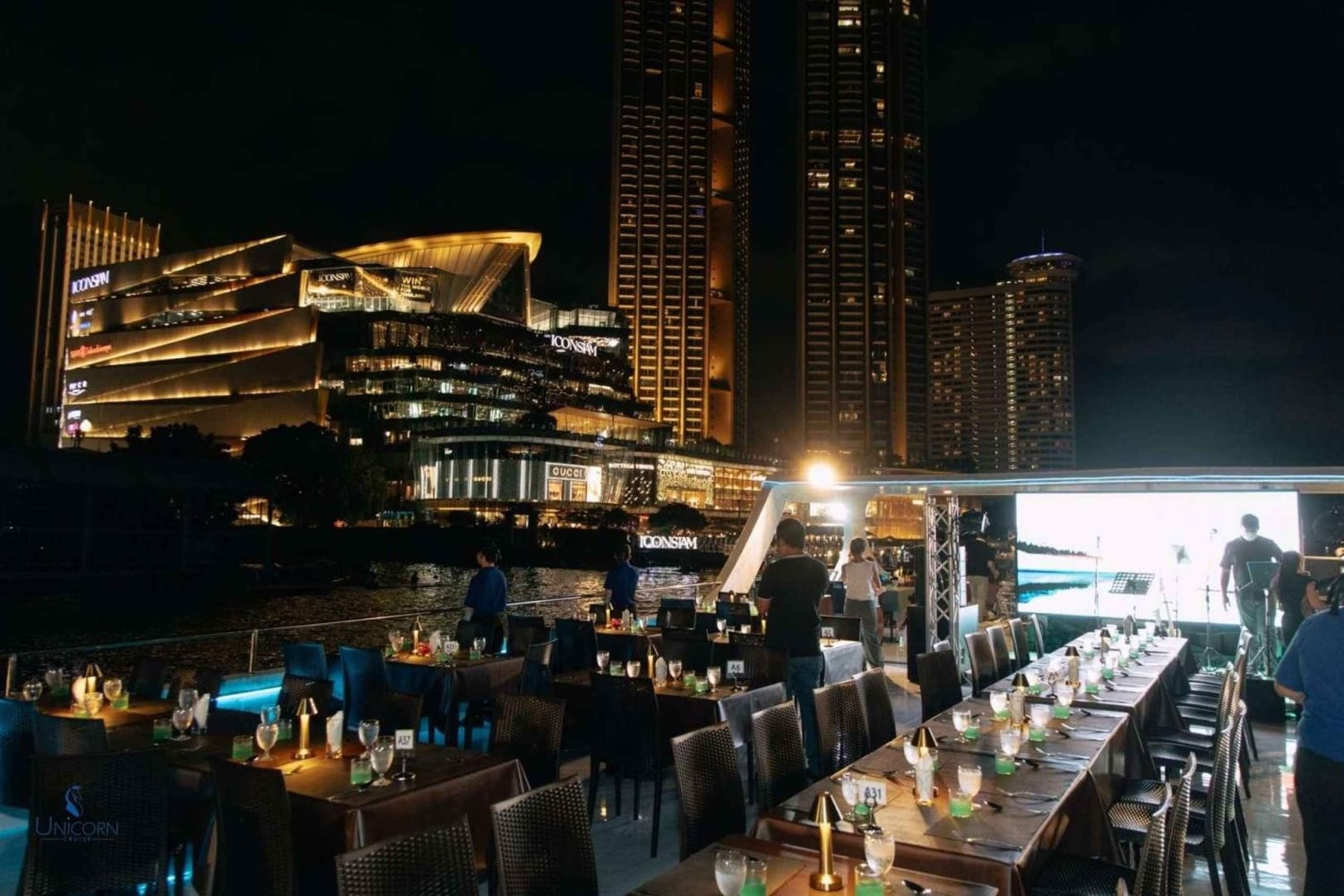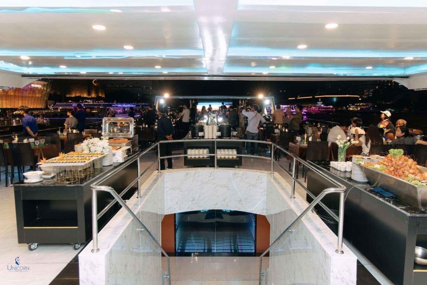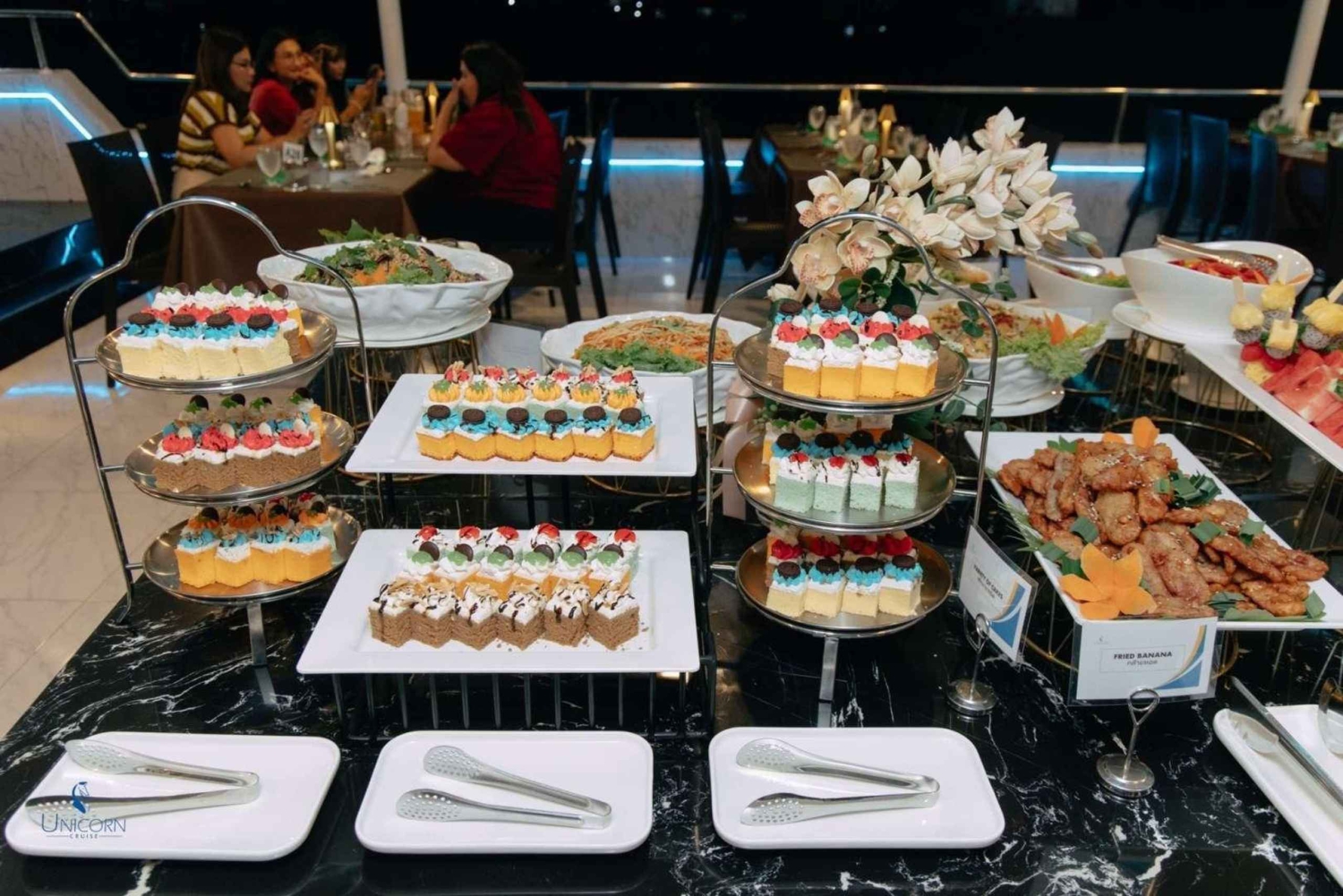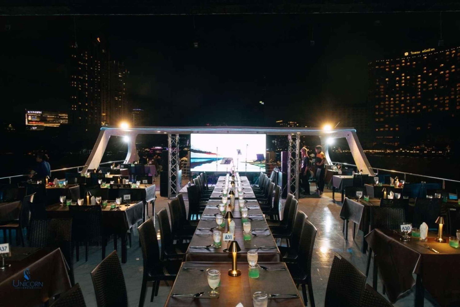 Kliv ombord på Unicorn Cruise för en fascinerande kväll på Bangkoks Chao Phraya River. Börja kvällen med ett varmt välkomnande på ICONSIAM Pier och sätt sedan segel förbi Bangkoks mest ikoniska landmärken, alla vackert upplysta under kvällshimlen - från den majestätiska Wat Arun till det historiska Grand Palace. Njut av en överdådig internationell skaldjursbuffé med flodräkor, chilenska musslor och en härlig lax-sashimi-station, allt medan ett liveband fyller luften med musik som kompletterar den fantastiska utsikten. Denna kryssning är perfekt för familjer, par, soloäventyrare och grupper och erbjuder en oförglömlig blandning av middagar, sightseeing och underhållning, vilket gör den till ett måste för att uppleva Bangkoks magi från vattnet.Includes