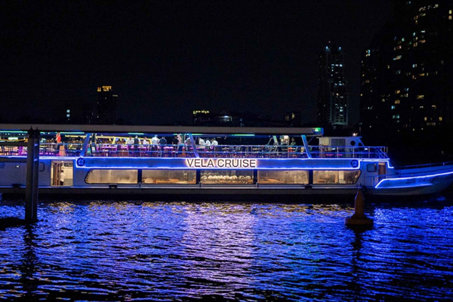 Njut av en VELA-kryssning från Asiatique Pier 1 med buffémiddag, kulturella shower och fantastisk utsikt över Bangkoks skyline längs Chao Phraya-floden.
